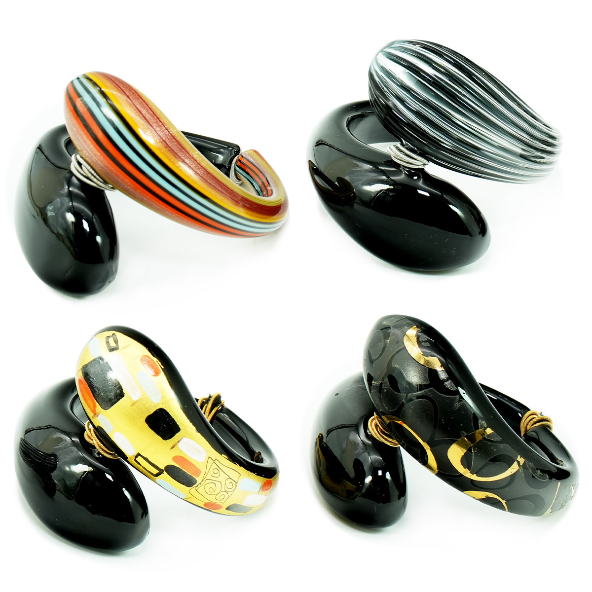 Elegante bracciale dal design ricercato. I gioielli sono in vetro soffiato a mano con la tecnica della lavorazione al lume. A freddo vengono invece dipinti in stile con oro 24kt. Peso molto leggero essendo in vetro soffiato e vuoto all'interno.