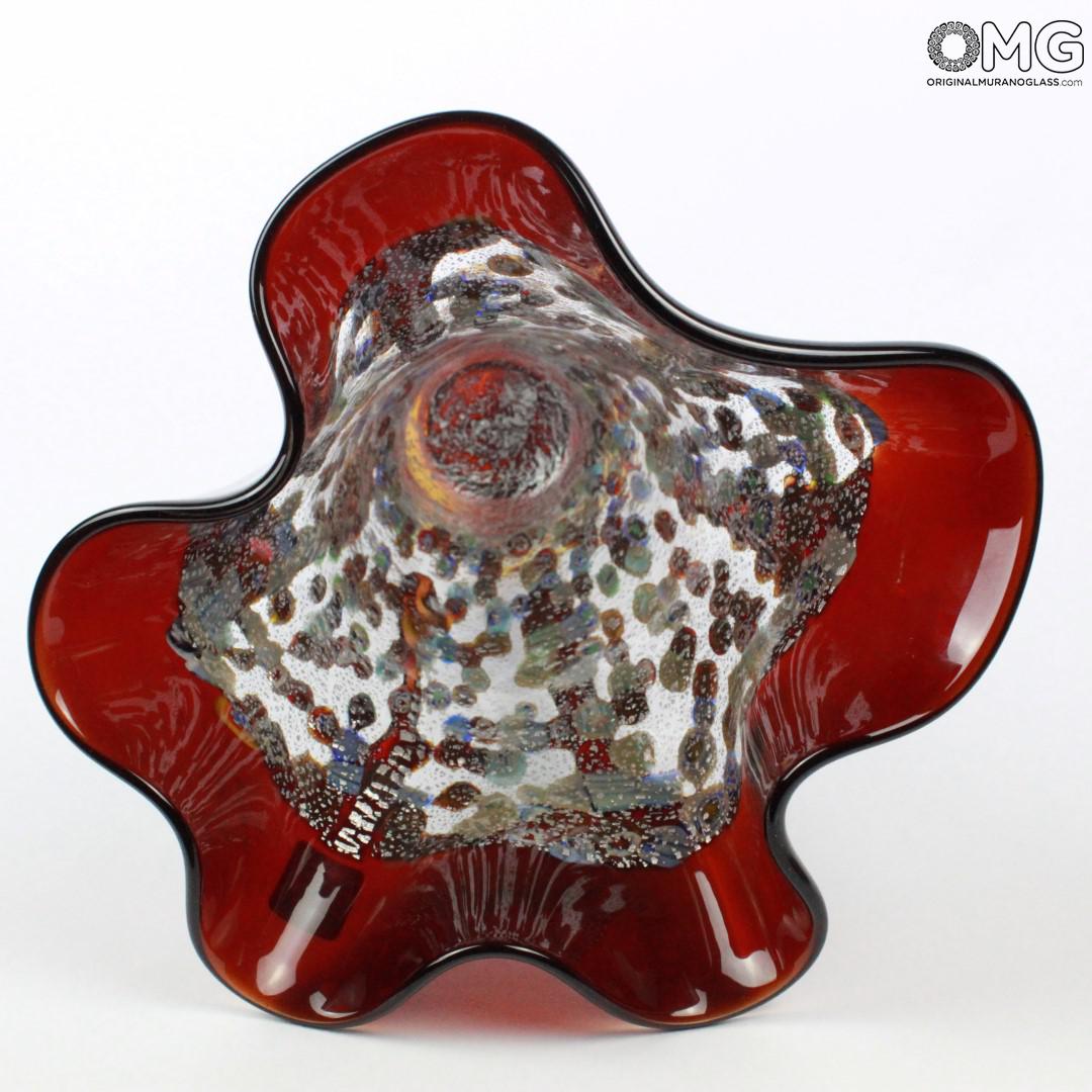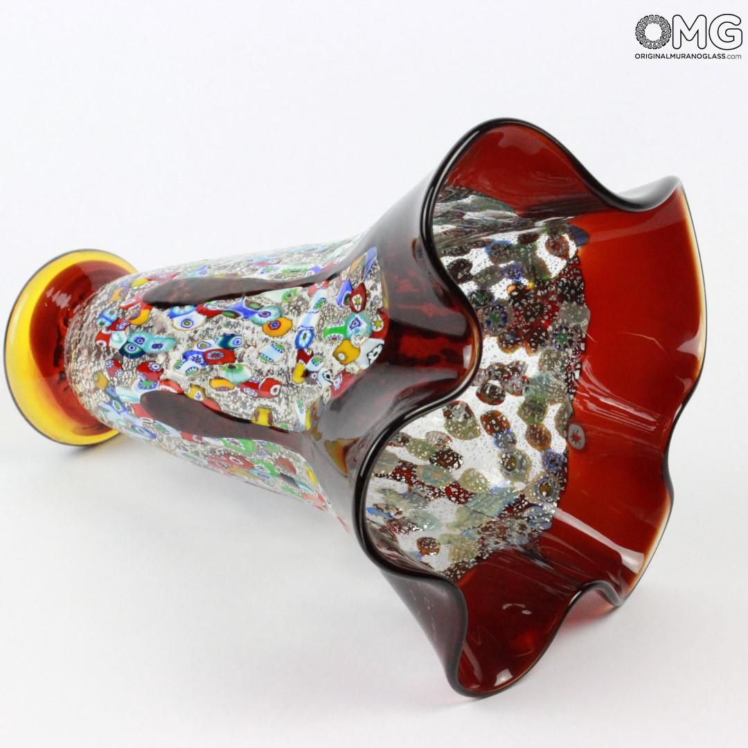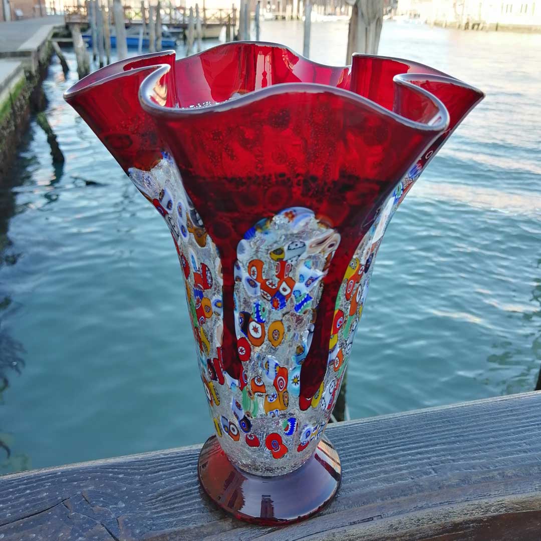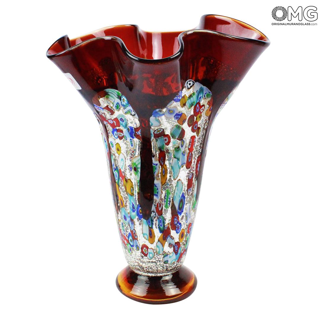 I festosi mosaici millefiori colorati sono sparsi sul vetro di cristallo con pezzi scintillanti di lamina d'argento autentica incastonata, e il ricco vetro ametista nella parte superiore sembra scorrere lungo il vaso in una vera espressione dello stile artistico di Murano. L'incredibile aspetto del vetro millefiori è ulteriormente arricchito dall'esclusiva forma "fazzoletto" , inventato dai maestri muranesi per ottenere la squisita leggerezza ed eleganza delle pieghe del fazzoletto in vetro Con o senza fiori, farà un centrotavola perfetto e aggiungerà un tocco di famoso design italiano e opulenza veneziana a casa tua..