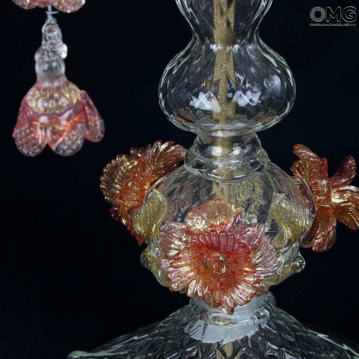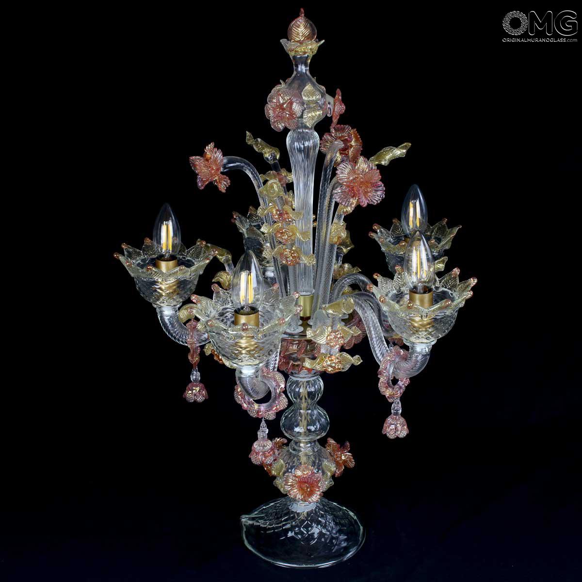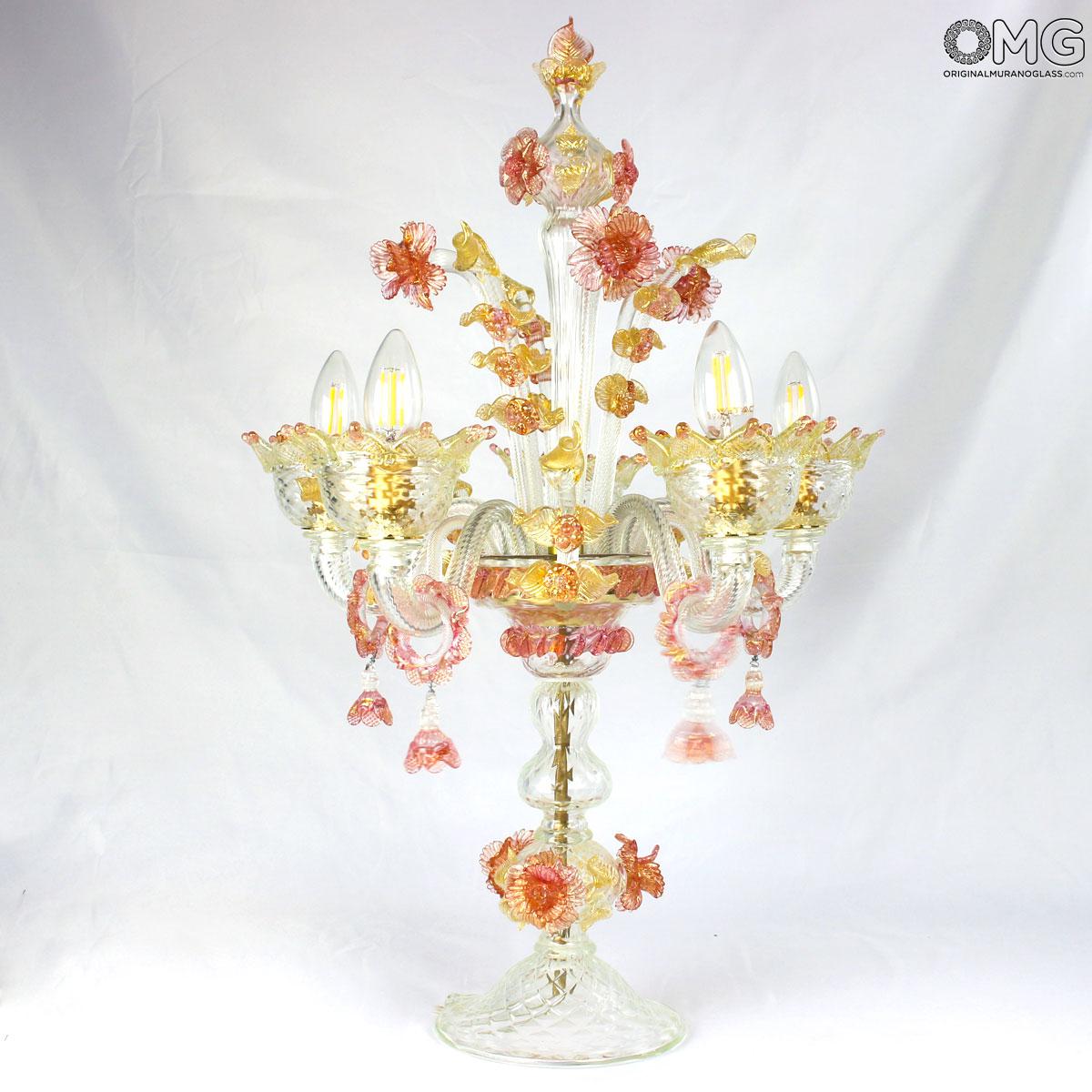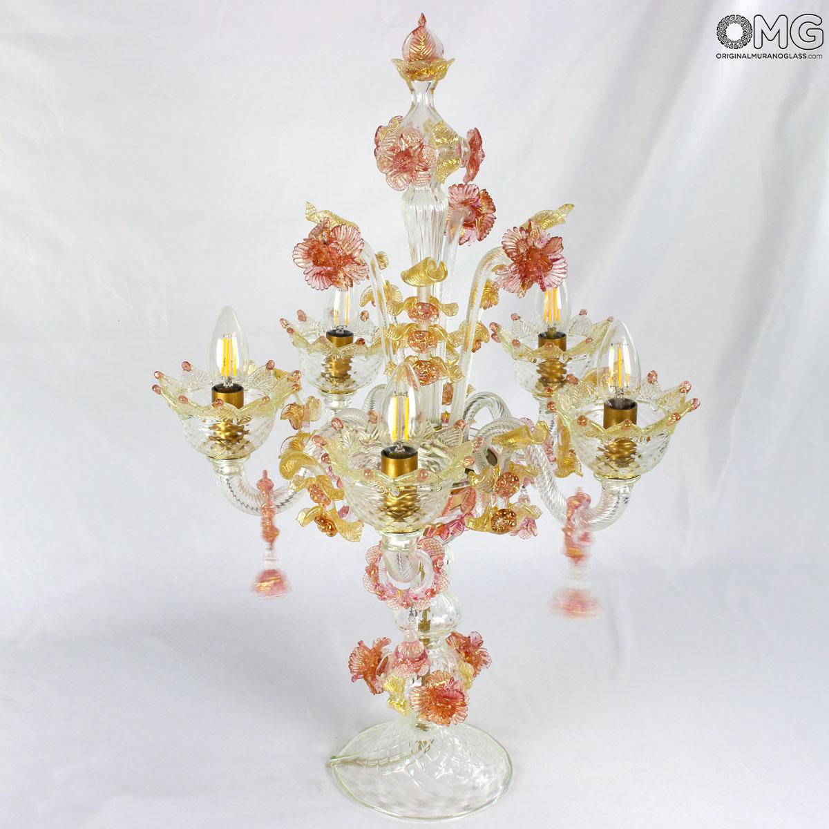 Flambeau a 5 luci, vetro veneziano trasparente con finiture rosa e oro. Flambeau fatto a mano secondo l'antica tradizione del vetro di Murano, realizzata artigianalmente in vetro soffiato. L'opera è disegnata secondo il famoso stile Veneziano,che arricchisce l'ambiente con eleganza. Pezzo di meravigliose caratteristiche di bellezza e di classe.