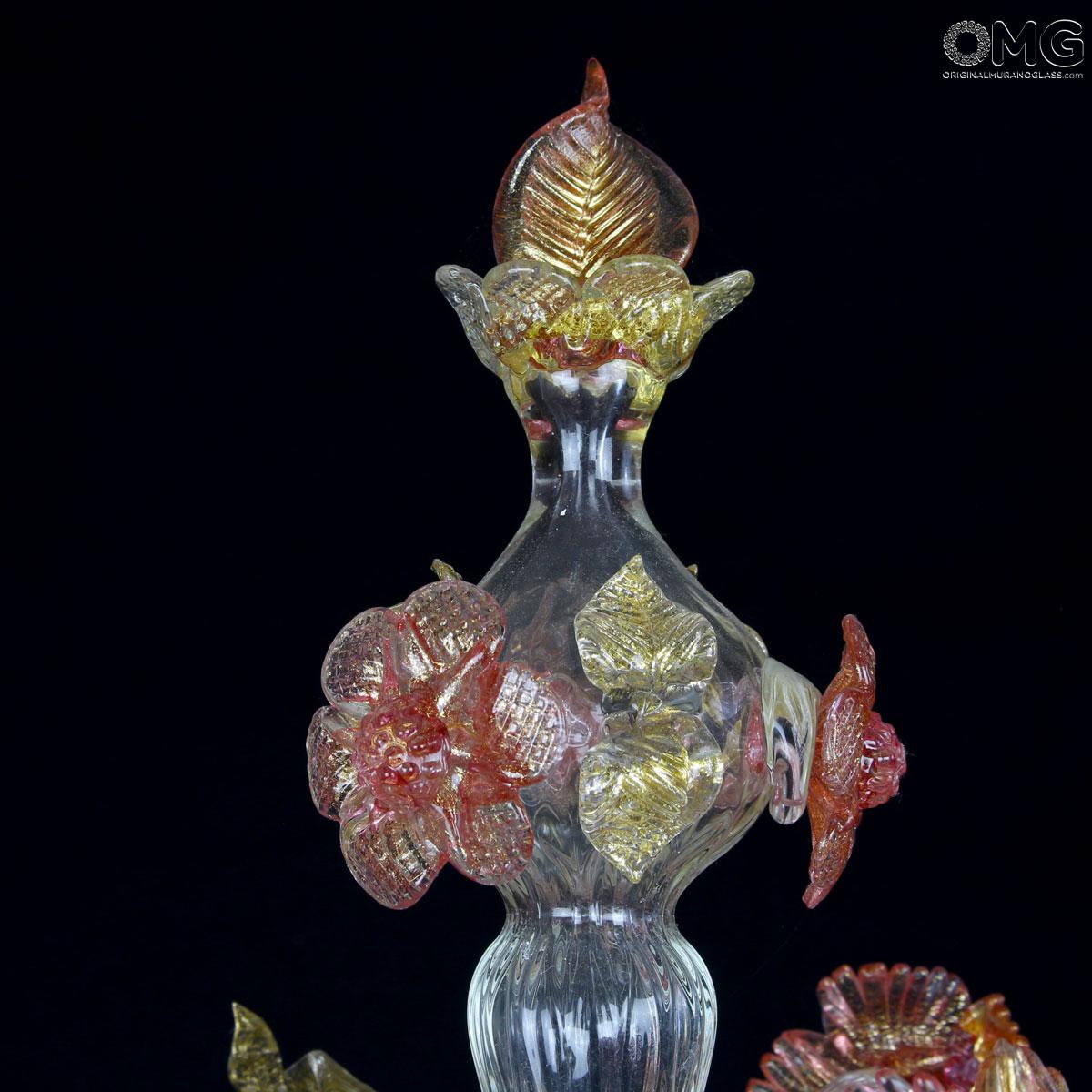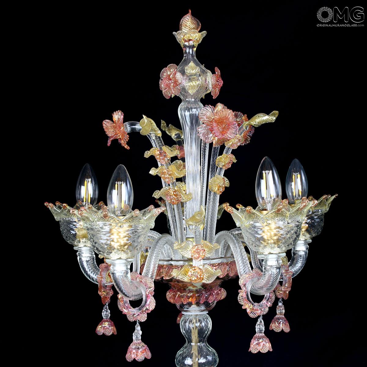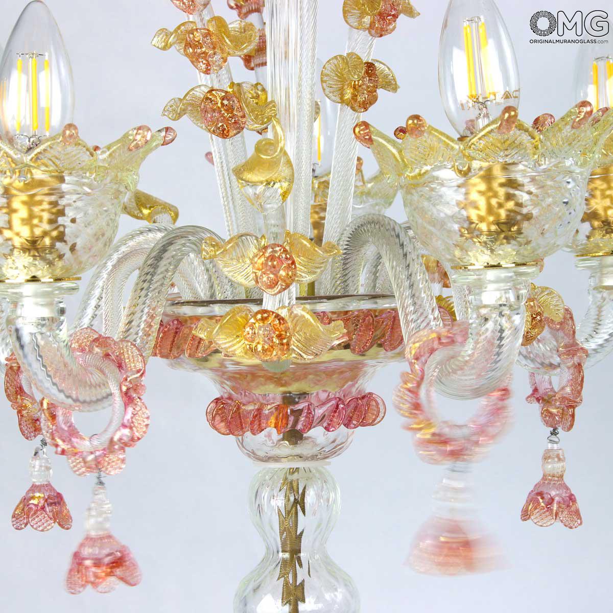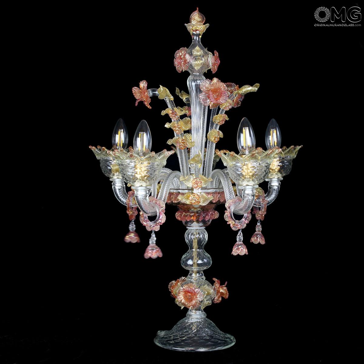 Flambeau a 5 luci, vetro veneziano trasparente con finiture rosa e oro. Flambeau fatto a mano secondo l'antica tradizione del vetro di Murano, realizzata artigianalmente in vetro soffiato. L'opera è disegnata secondo il famoso stile Veneziano,che arricchisce l'ambiente con eleganza. Pezzo di meravigliose caratteristiche di bellezza e di classe.