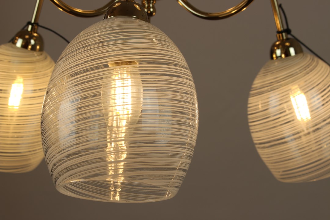 Lampada a 5 luci, montatura oro, tazza portalampada in vetro artistico con decori con linee colorate. La lampada vi da la possibilità di cambiare i decori in superficie delle tazze, contattateci per qualsiasi decorazione.