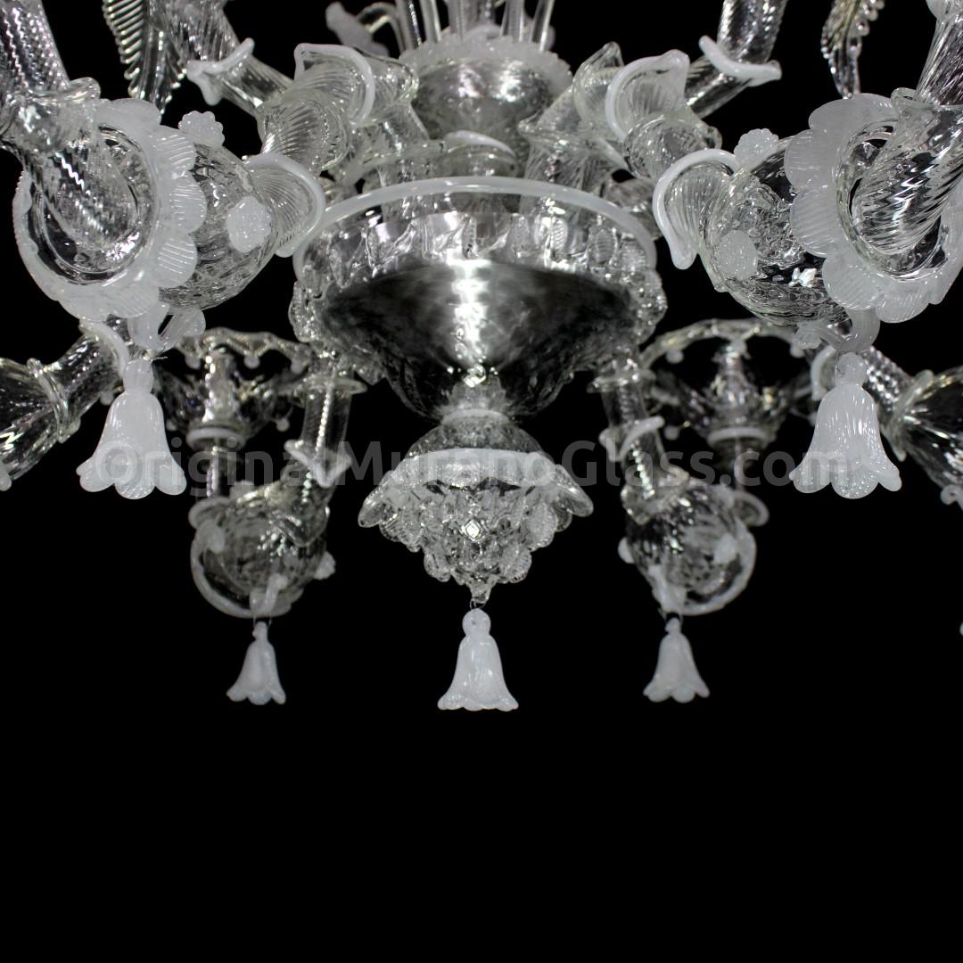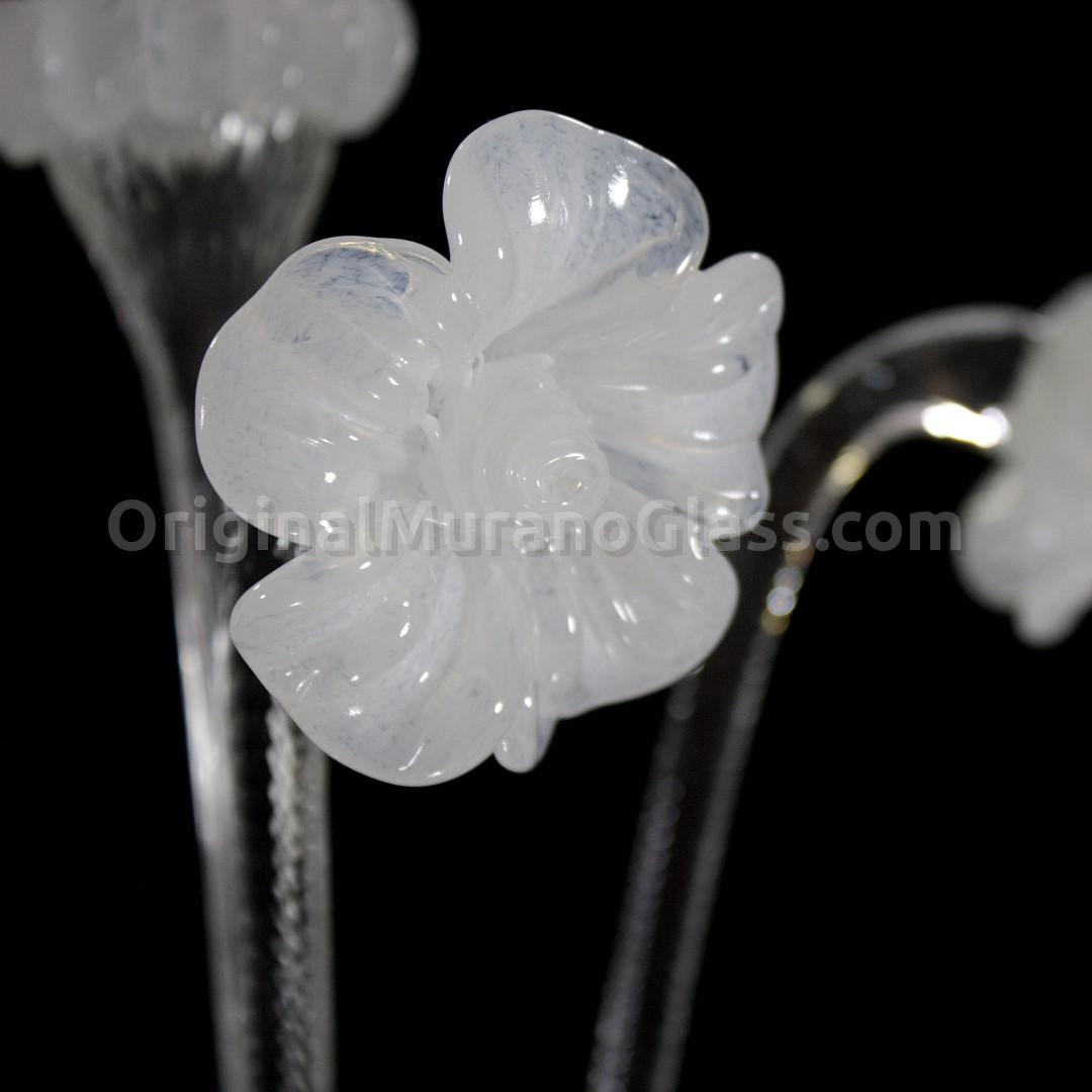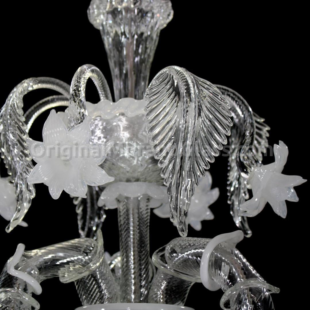 Lampadario Rezzonico in vetro artistico veneziano color cristallo con finiture fiori e dettagli in vetro bianco.