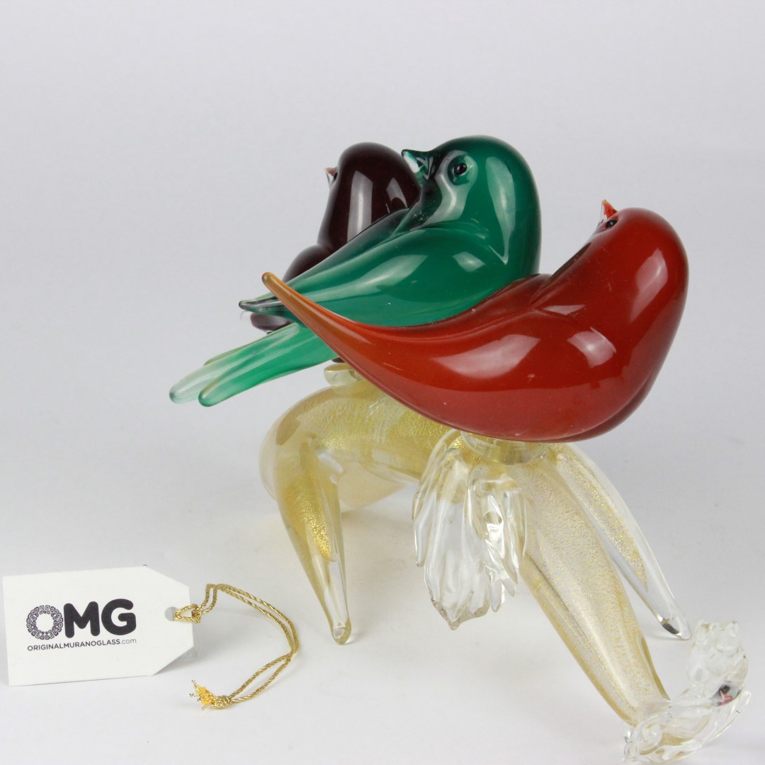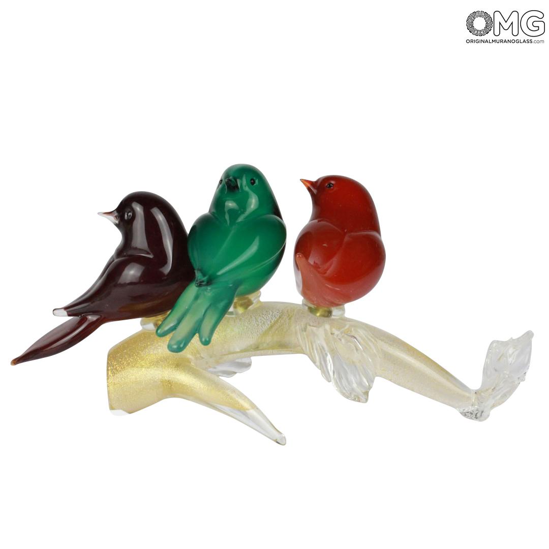 3 uccelli su ramo Oro - decoro in foglia oro - Vetro di Murano Originale OMG