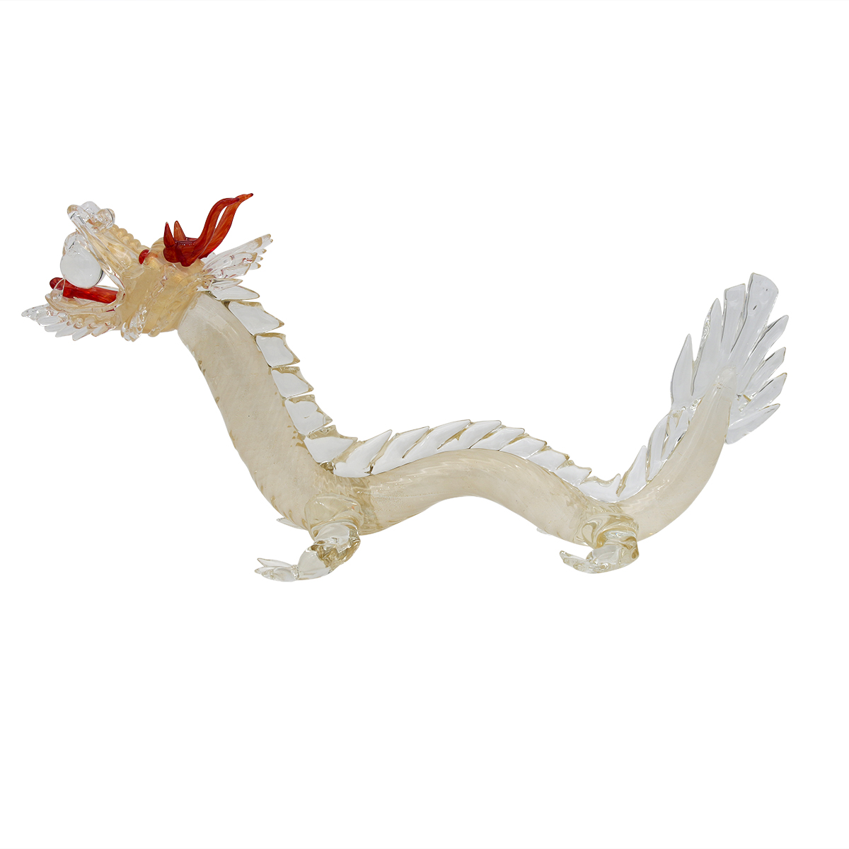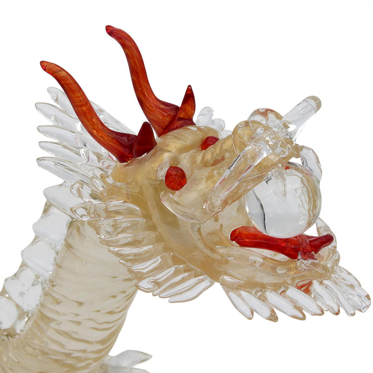 Esclusiva scultura di drago in vetro di Murano lavorata a mano e decorata con un prezioso decoro in vera foglia d'oro 24 carati.