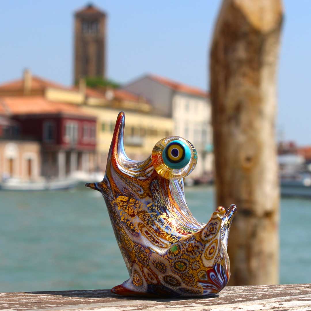 Mini figurina, scultura realizzata a mano a Murano con murrine in vetro e oro puro. L'opera è realizzata interamente a mano e senza utilizzo di stampi, ogni pezzo è unico.