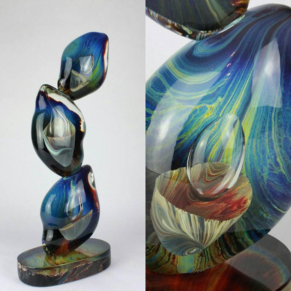 Notare i surreali effetti di colore che cambiano continuamente allo spostamento dell'osservatore, rendono l'opera viva e in movimento, con tonalità diverse di blu, ambra, fino a leggere venature di rosso. L'opera vista dal vivo è persino più bella.