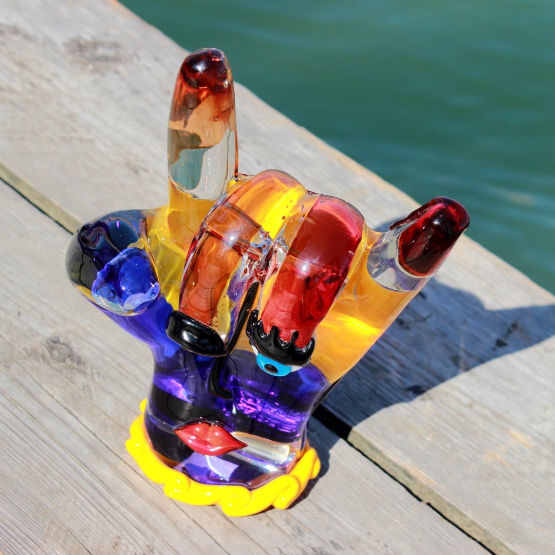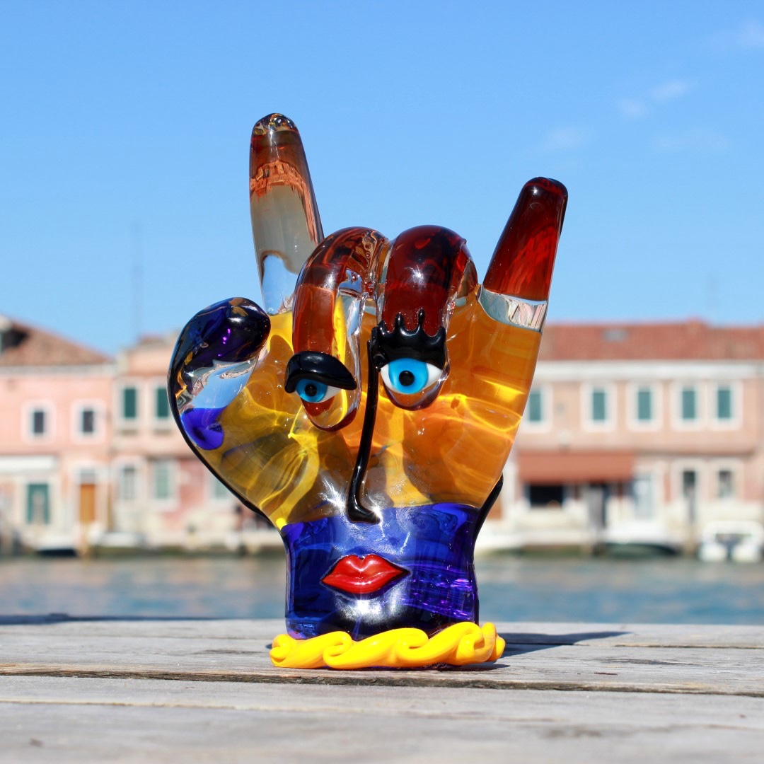 L'arte del vetro di Murano ottiene un inaspettato tocco contemporaneo in questa scultura unica della mano di Picasso. In un omaggio all'artista più famoso e rivoluzionario del XX secolo, Pablo Picasso, gli inventivi maestri di Murano hanno creato questa scultura in vetro di Murano, che riflette lo stile astratto e l'approccio d'avanguardia di Picasso all'arte. La mano ispirata a Picasso rappresenta il movimento surrealista nell'arte, con colori vivaci e tratti del viso. I ricchi colori profondi del rosso, giallo, arancione e blu e gli occhi azzurri curiosi trasmettono uno stato d'animo solare e un'atmosfera di liberazione dai canoni dell'arte e della tradizione.