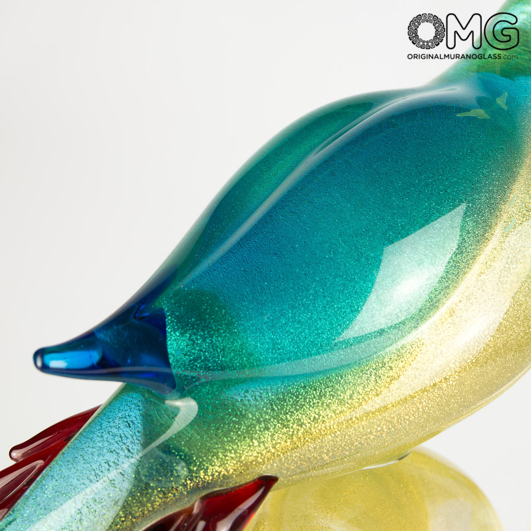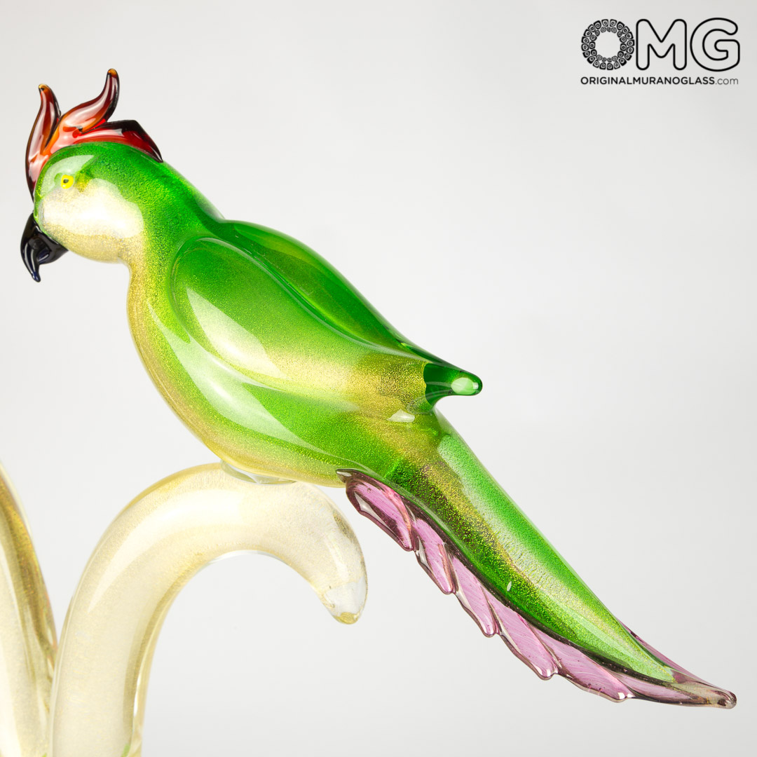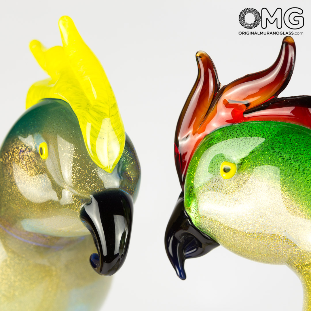 Scultura in vetro realizzata con oro 24 carati ed altri impreziosimenti in vetro colorato rappresentante due graziosi pappagalli su un ramo.