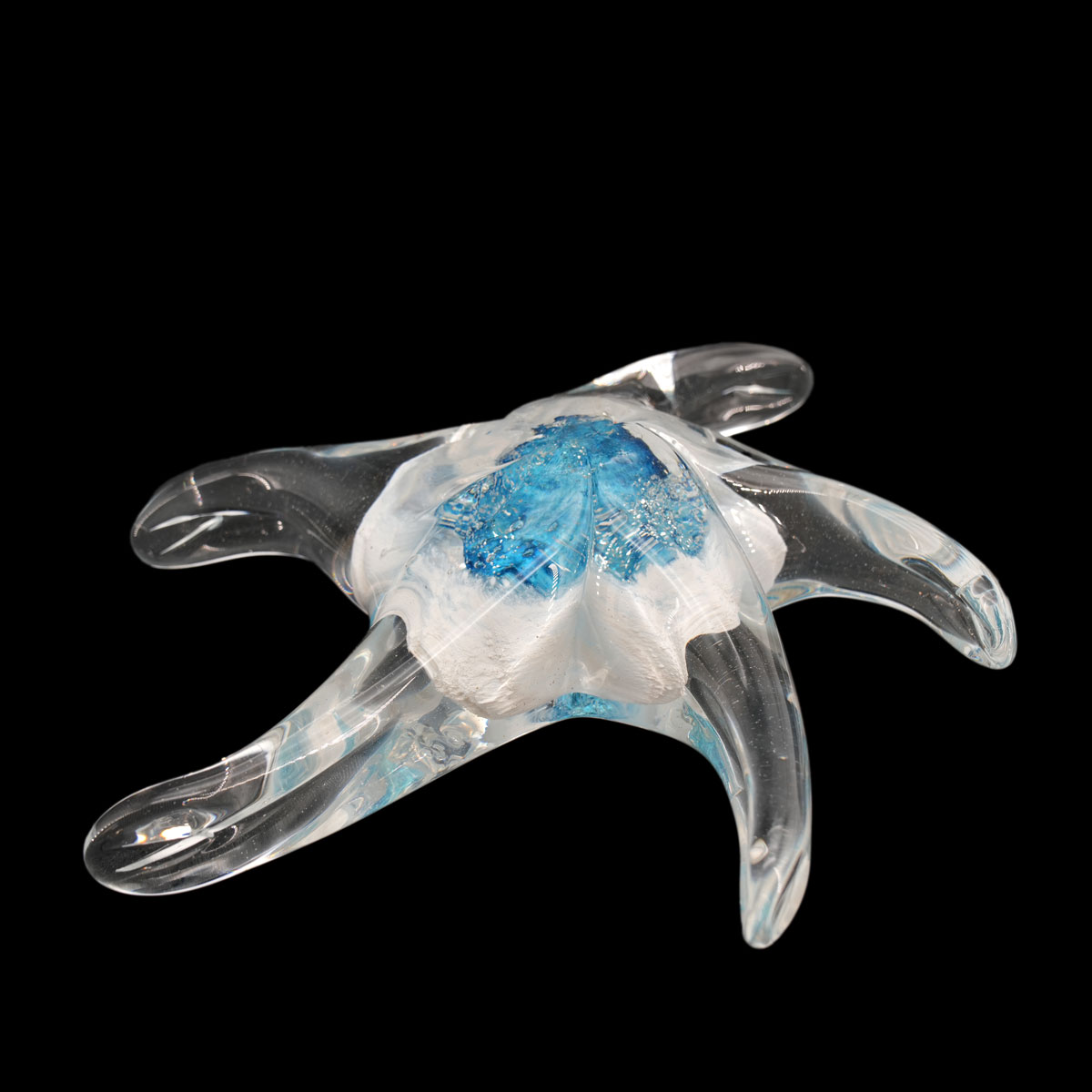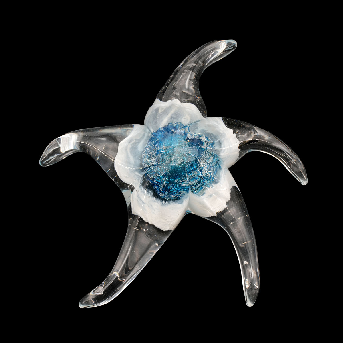 Esclusiva scultura di stella marina in vetro di Murano lavorata a mano e decorata con un vivace motivo color azzurro che da vita ad affascinanti sfumature.
