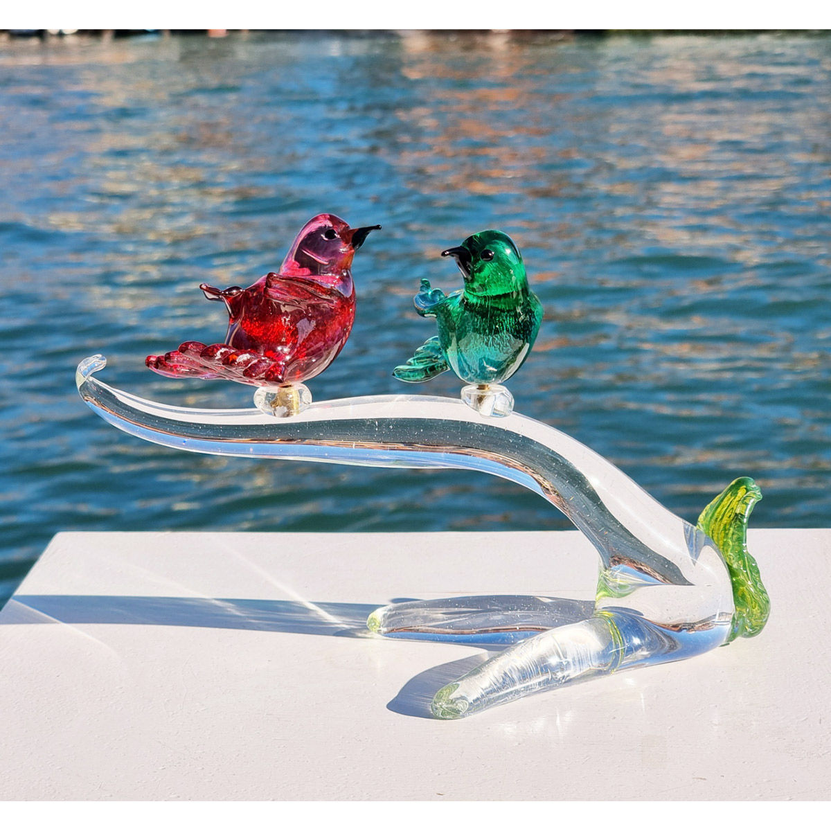 Scultura originale in vetro di Murano raffigurante una coppia di uccellini delicatamente appoggiati su una base di cristallo a forma di ramo. L'opera è realizzata a Murano e ogni uccello è meticolosamente lavorato a mano libera dai nostri maestri.