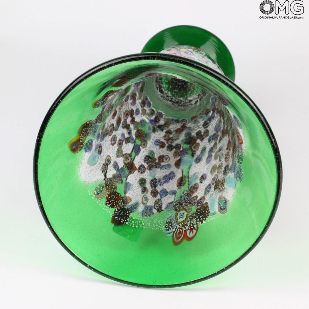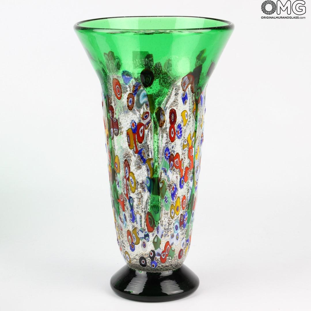 Il vaso è realizzato con la tecnica del vetro soffiato con le murrine millefiori miste colore e argento. L'opera firmata dal maestro e con il marchio Vetro Artistico® Murano applicato.