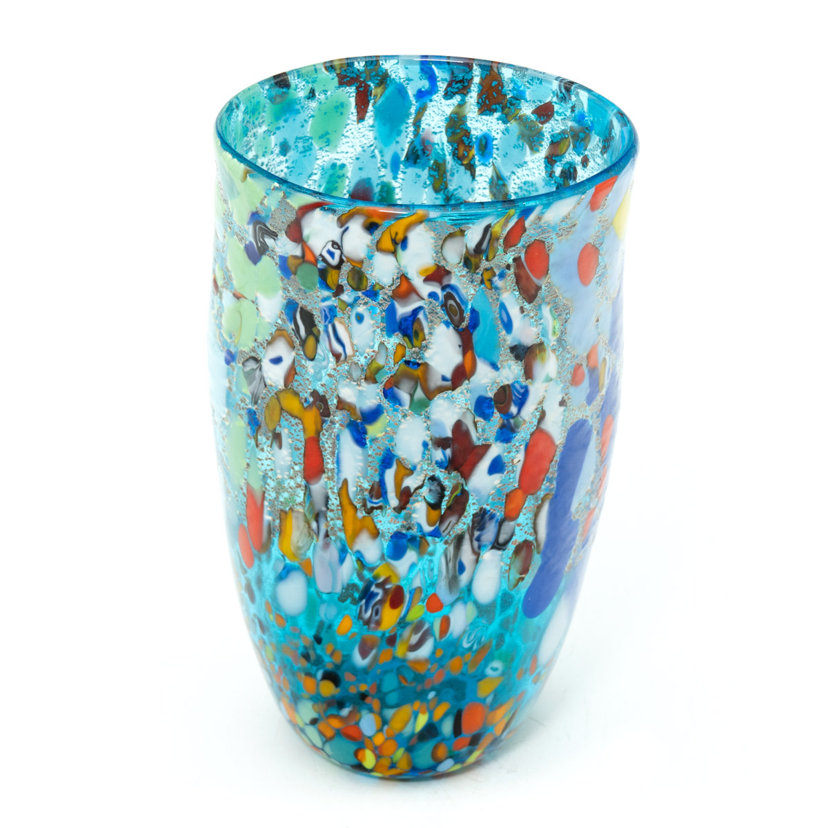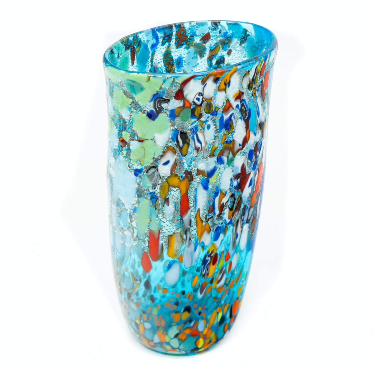 Vaso in vetro soffiato e decorato con murrine e foglia argento. Un vaso semplice ma al contempo elegante ottimo per arredare e render curato ogni angolo della casa.