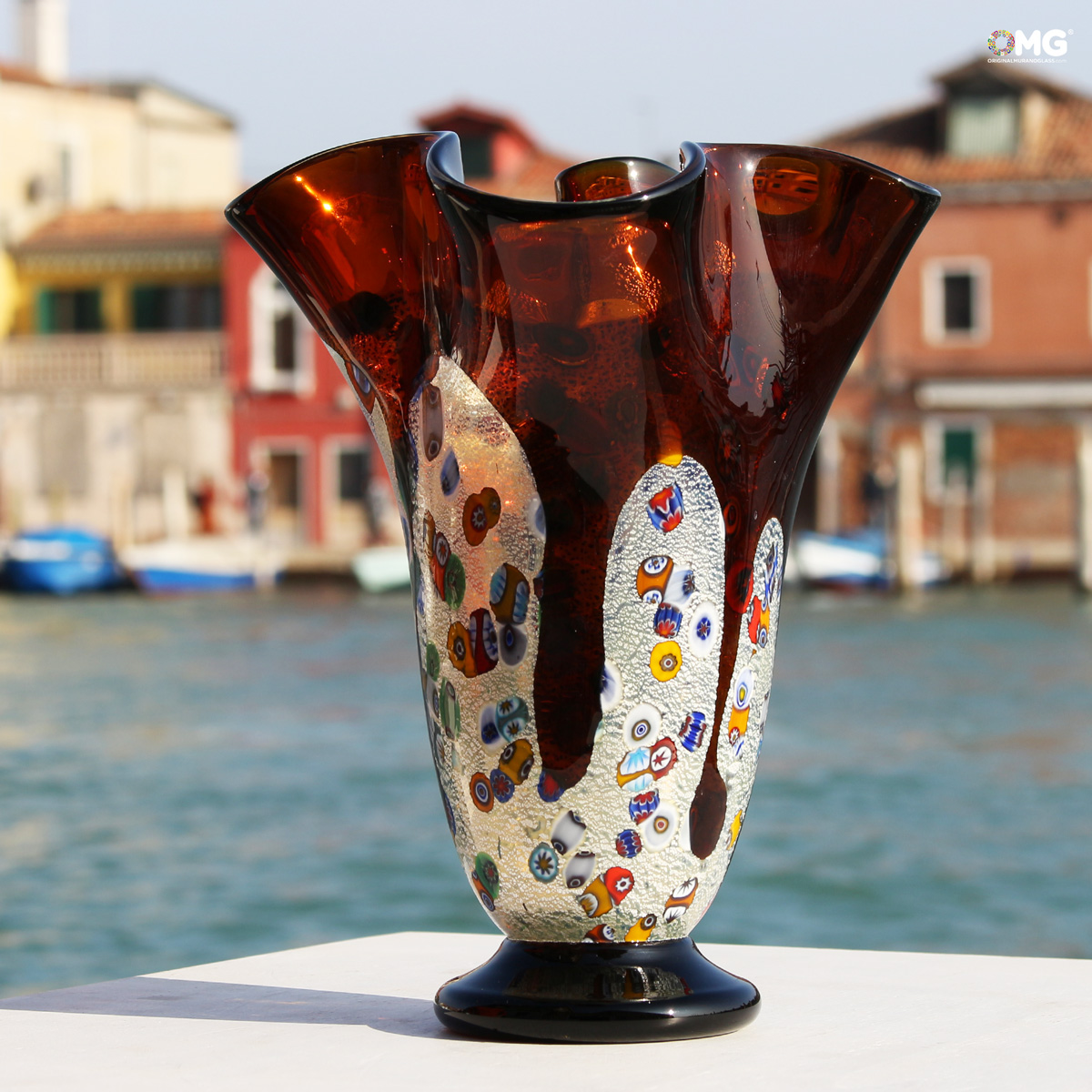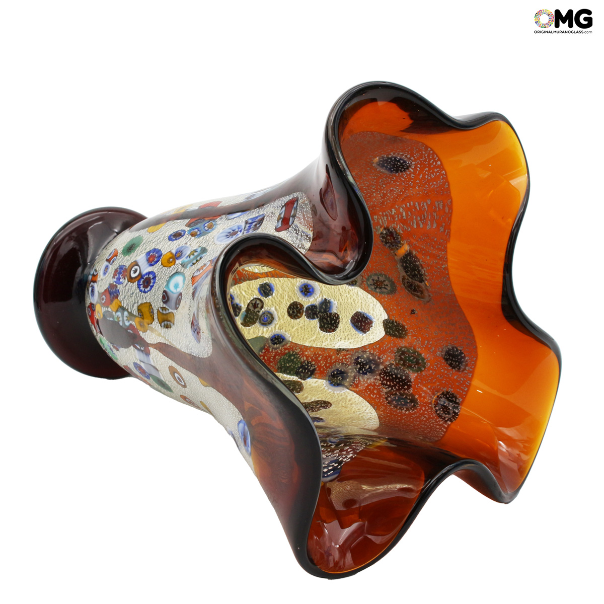 Vaso realizzato con la tecnica del vetro soffiato decorato con foglia d'argento e coloratissime murrine variegate.