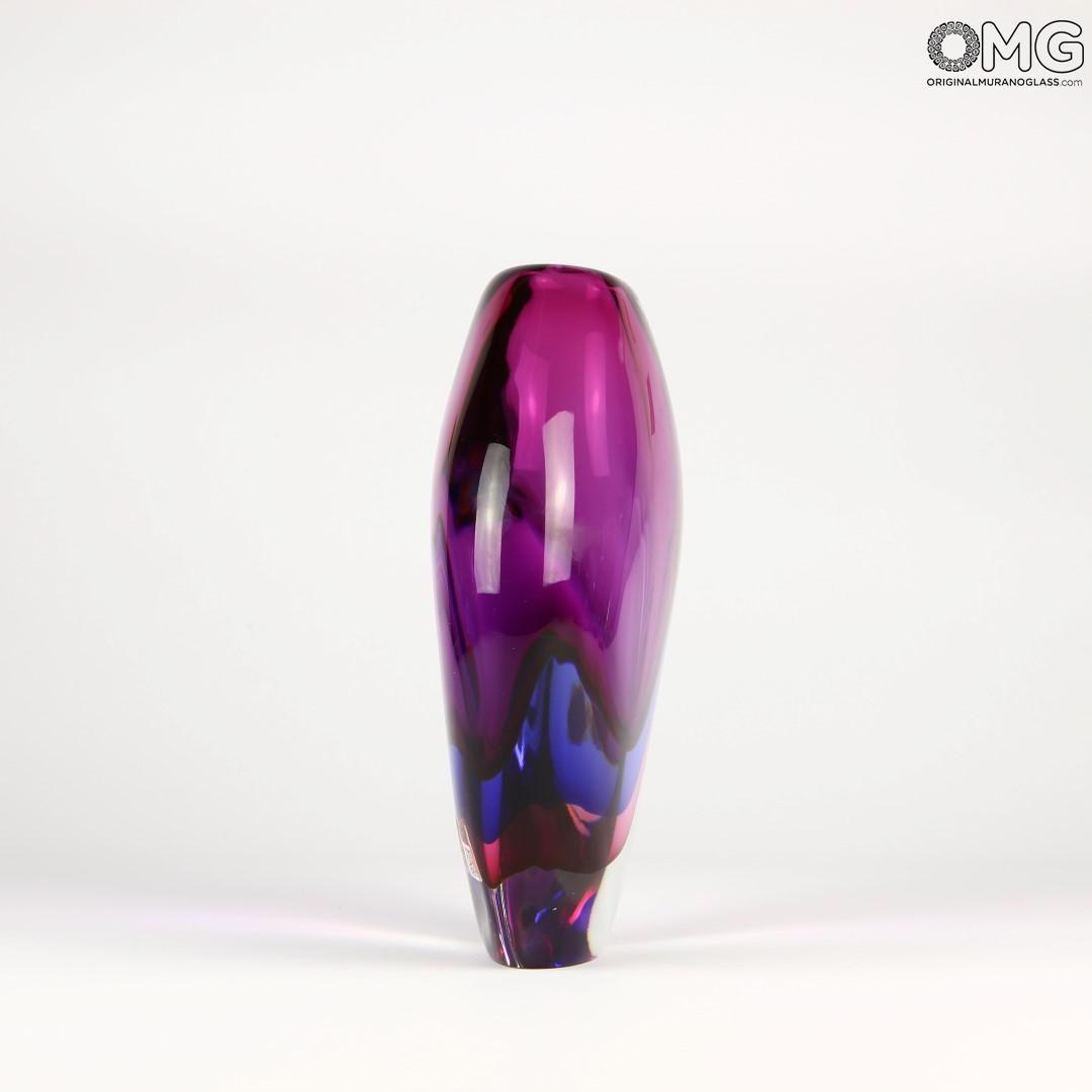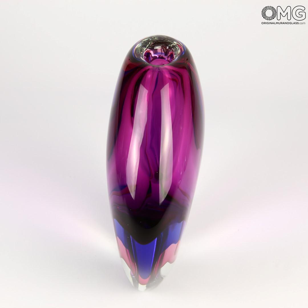 Vaso realizzato a mano di nobile fattura. Per realizzarlo una prima massa di viola pallido viene coperta da una di blu pallido, quindi di nuovo sommersa da una di viola e da una di cristallo. Dopo esser soffiato il vaso riceve gli ultimi ritocchi e l'opera d'arte risulta pronta. Un vaso variopinto ma allo stesso tempo sobrio ed elegante. Adatto ad abbellire un'ampia varietà di mobilio