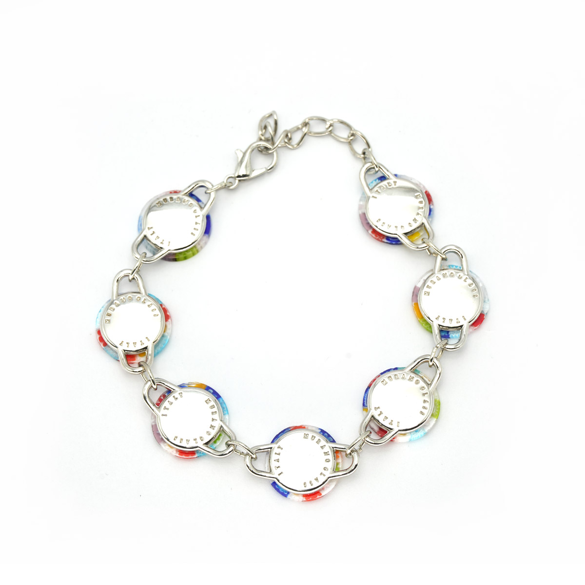 Unique and elegant, this Venetian bracelet is hand-made using the most famous Murano glass technique, Millefiori Murrina (a thousand flowers) - which has become a trademark of Murano glass making. This easily-recognizable Murano glass accessory features a symmetric eye-catching pattern of colorful stylized flowers in rich hues, which will add a touch of authentic Venetian style to any outfit. This bracelet is made in lamp working technique, and each piece is worked as single .