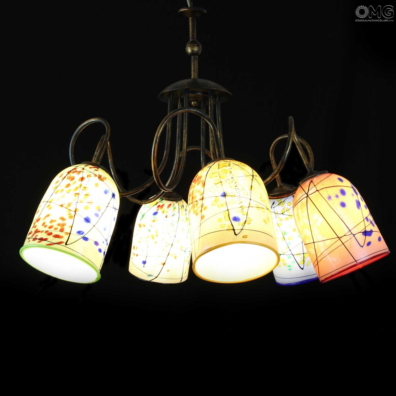 Original Murano Glass hanging lamp handmade in original venetian glass, with 6 cups holder in artistic glass with millefiori murrine and canes, with pure silver. The cup is very elegant and colorful. This Murano glass light will enrich your living room bed room and any room space with unique light colors.
