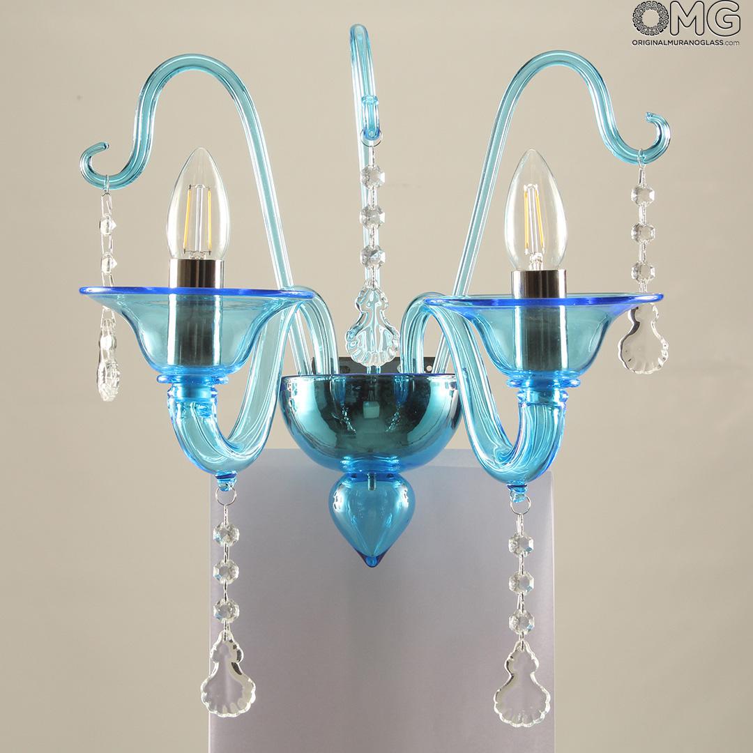Wall lamp 2 lights in Murano glass blue with crystall pendants.