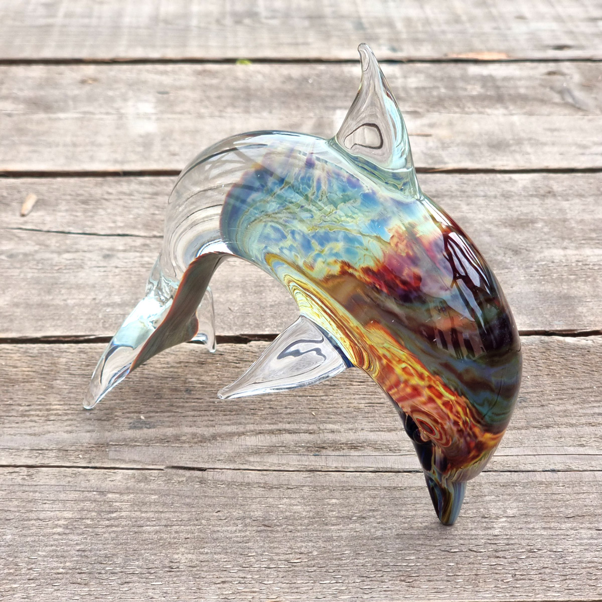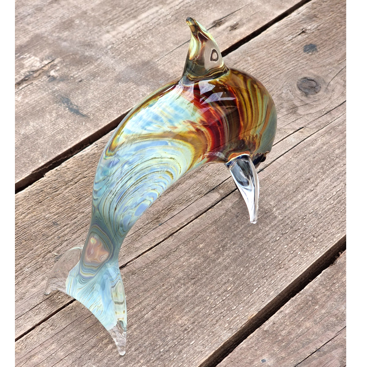 Exclusive and unique glass of dolphin handmade in clear glass and chalcedony, totally realized in free hand. Note the surreal color effects that are constantly changing when the observer moves, making the work alive and moving, with different shades of blue, amber, veins and shades of red. The artwork from real is absolutely nicer than in photo.