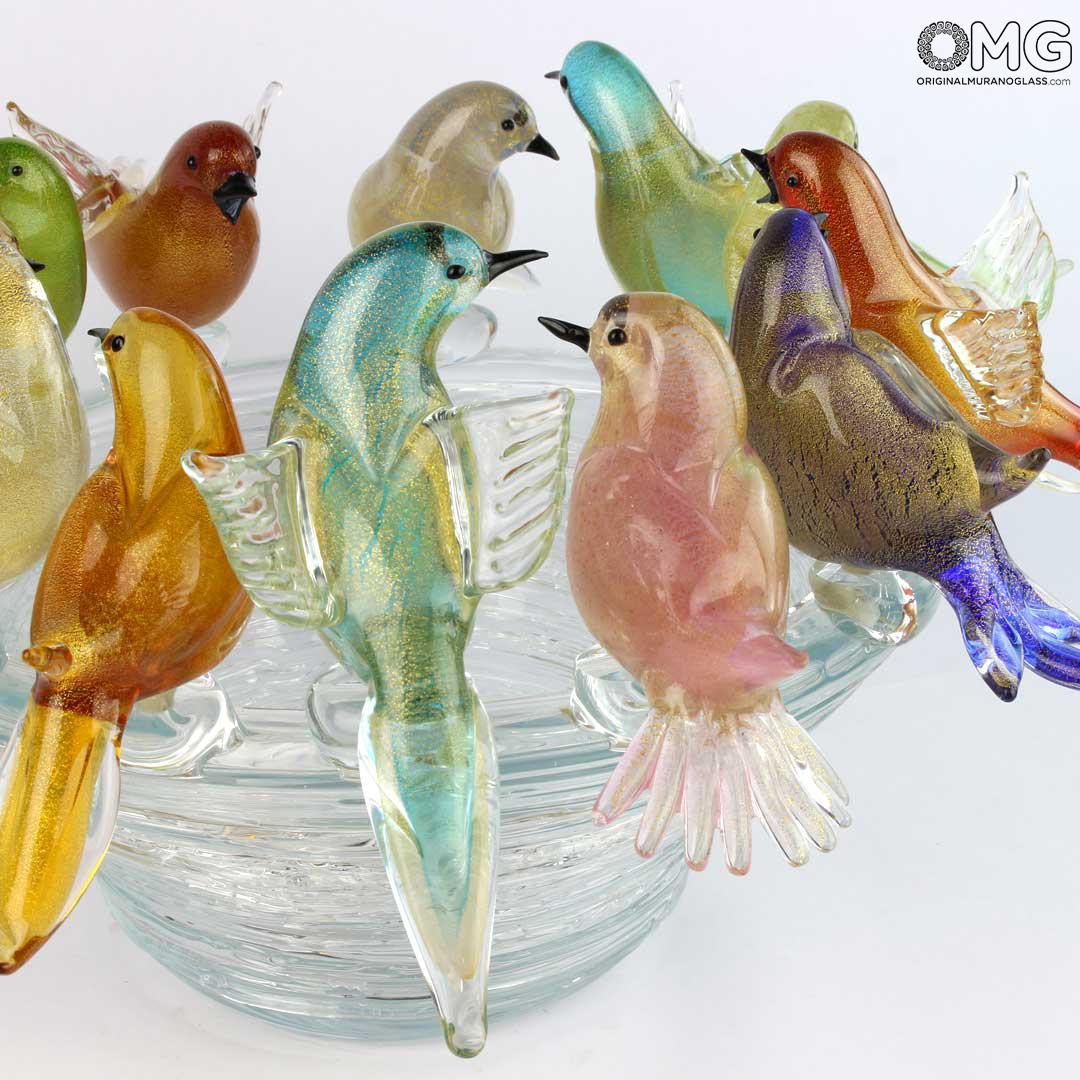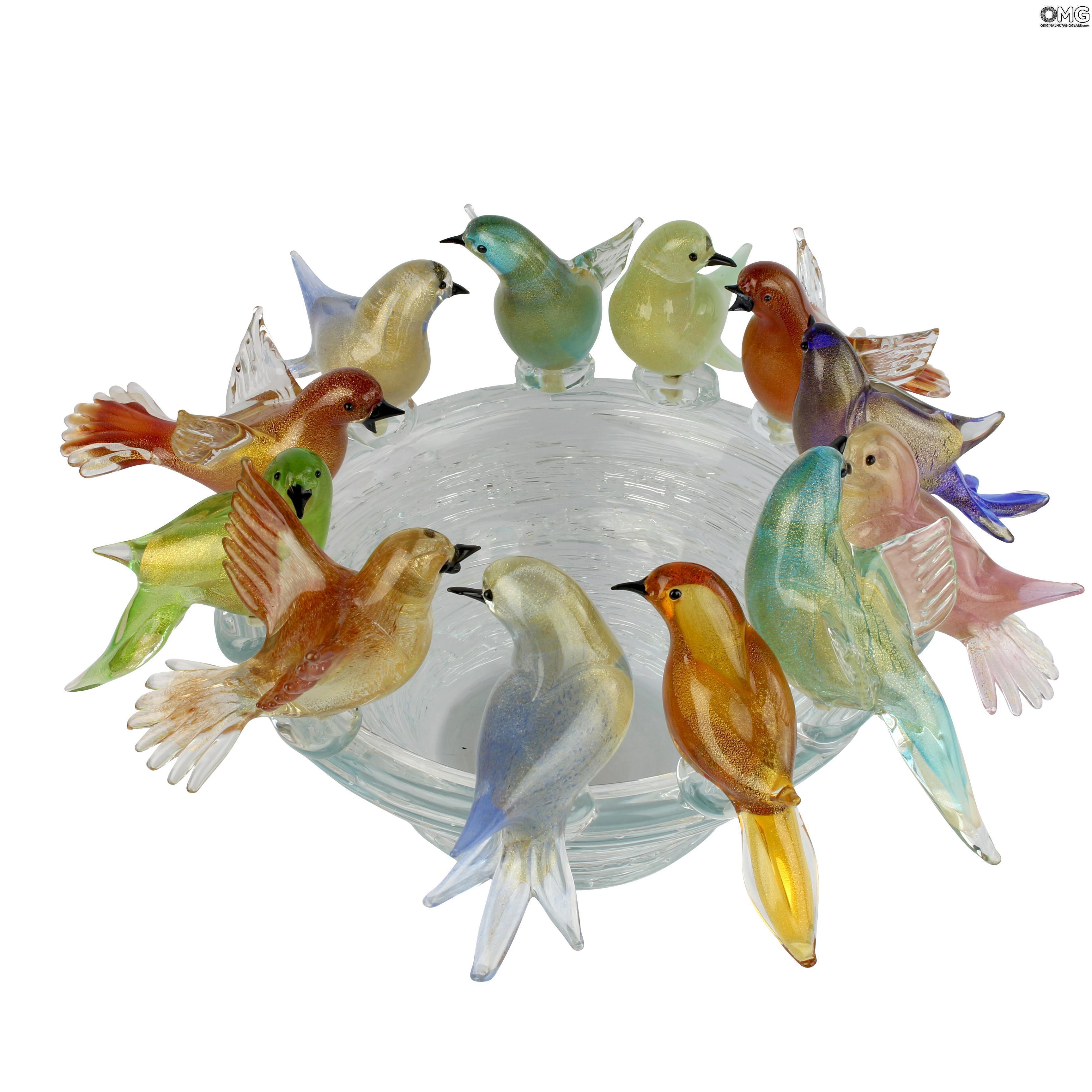 Nest with birds in forged glass. Sculpture of 12 birds embellished with details, entirely worked free hand.