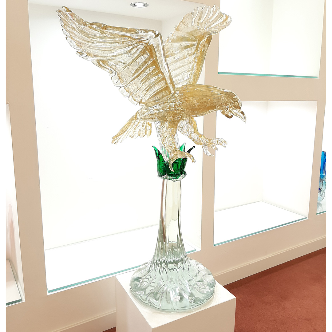Realistic sculpture of a eagle made with hot glass modeling technique using pure transparent glass and precious real 24 carats gold leaf decoration. Exclusive venetian glass sculpture made only for exclusive place.