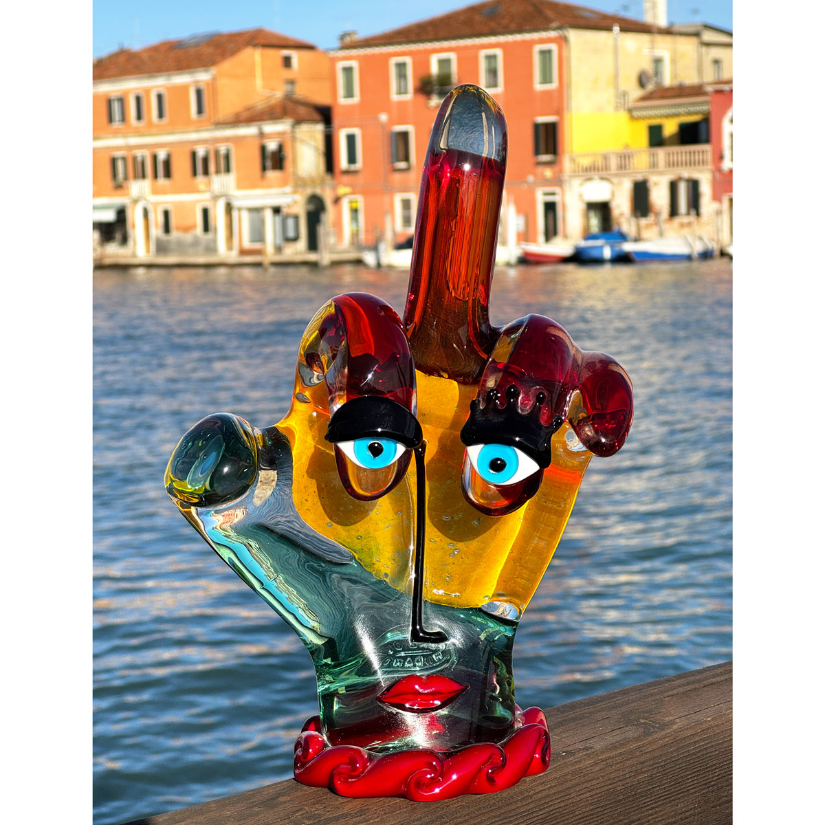 Murano Glass art gets an unexpected contemporary twist in this unique Picasso Hand sculpture. In a tribute to the most famous and revolutionary artist of the 20th century, Pablo Picasso, the inventive Murano masters created this Murano Glass sculpture, which reflects Picasso’s abstract style and avant-garde approach to art. The Picasso-inspired hand represents surrealist movement in art, with bright colors and face features. The rich deep colors of red, yellow, orange and blue, and inquisitive blue eyes convey a sunny mood and atmosphere of liberation from the canons of art and tradition. Authentic Murano Glass Picasso figures are some of the most valuable art glass pieces found only in a few select galleries in Venice. They make a unique gift for anyone who loves modern art, admires Pablo Picasso and his style, and appreciates Murano Glass and Venetian craftsmanship.