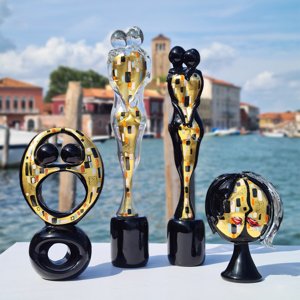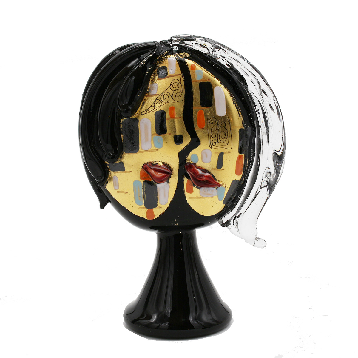 Abstract head sculpture handmade with the technique of warm glass modellation. The surface is hand paitned and engraved with gold leaf with Klimt design. Handmade for our selection of lovers sculptures.