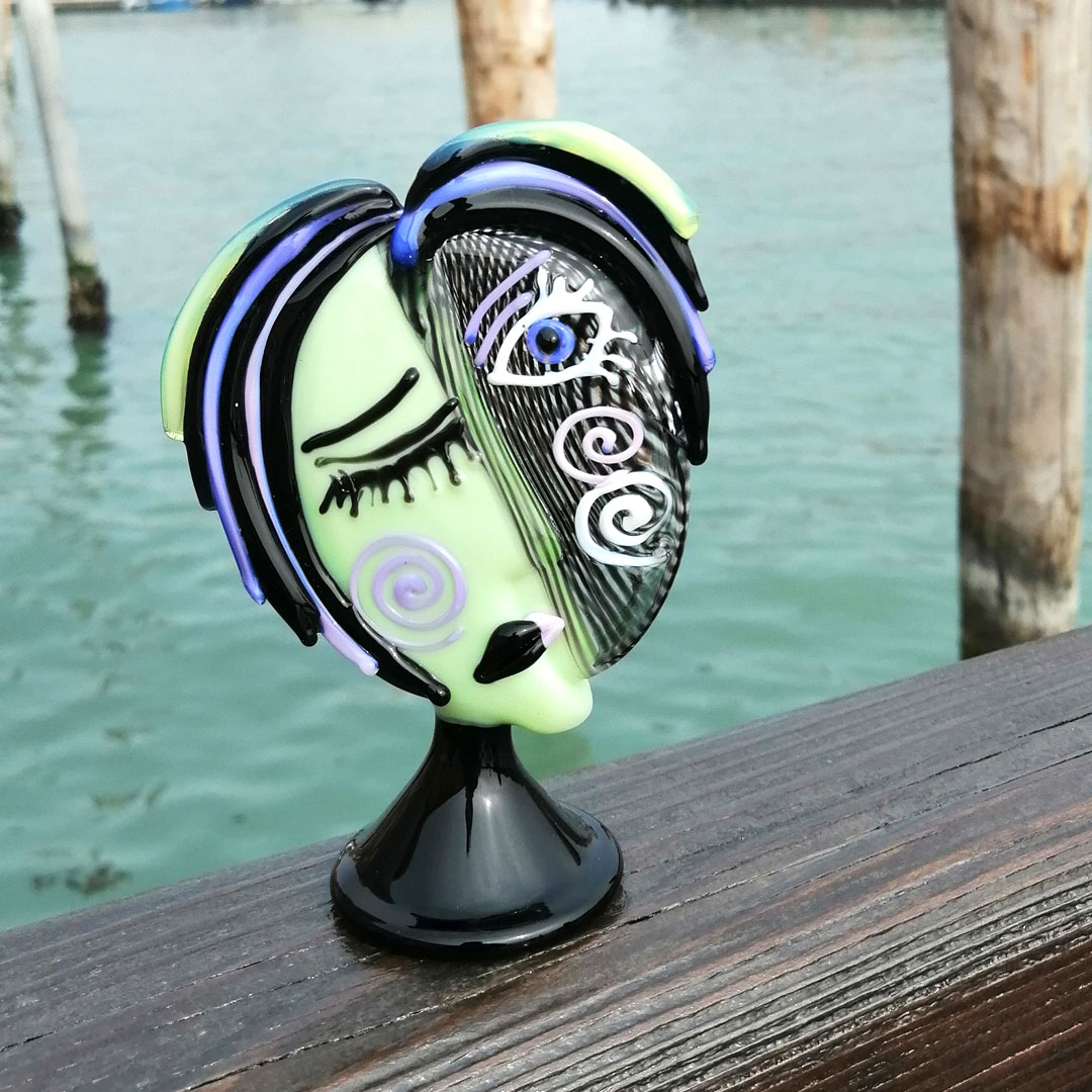 Abstract sculpture with modern design, the style is reminiscent of the paintings of the great artist Picasso, surrealism has been reinterpreted in punk and pop style. This tiny original Murano glass sculpture is made freehand with lamp working technique. Abstract modern subject. Shades of colors and strong visual impact.