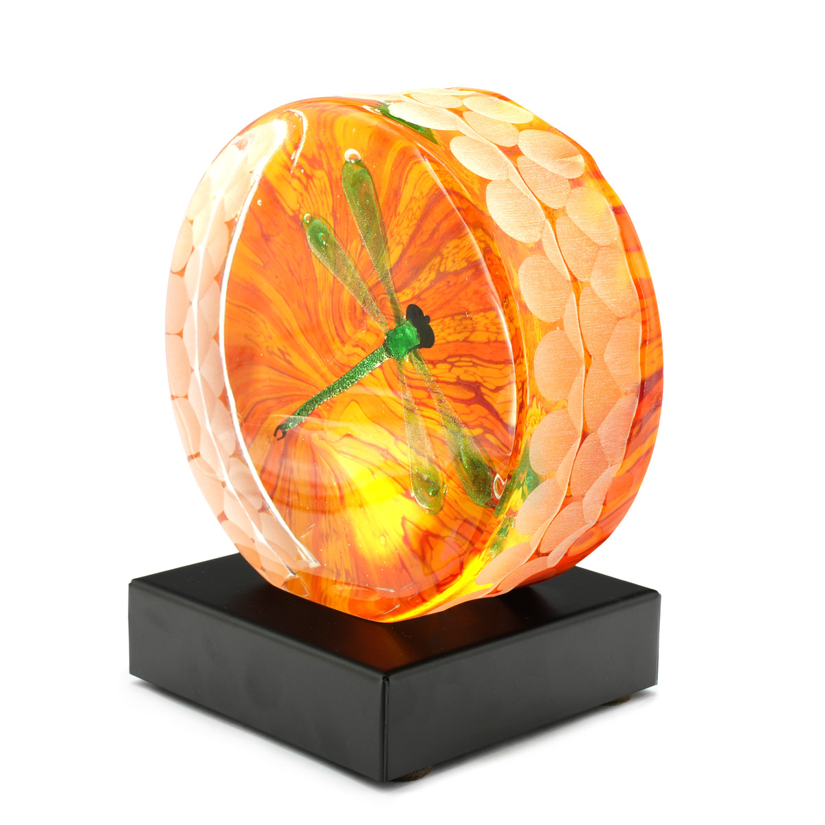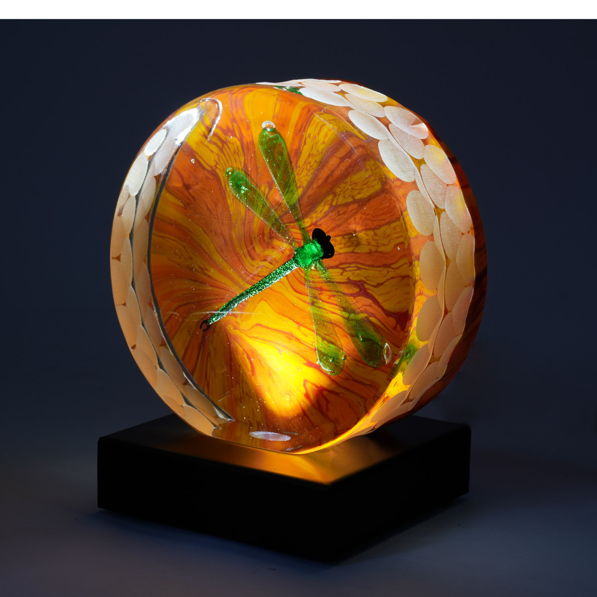 This is a stunning Murano submerged glass sculpture featuring a delicate green dragonfly encapsulated in vibrant orange and yellow swirling patterns. The artistry highlights the traditional craftsmanship of Murano glassmaking, with the layers of transparent and colored glass creating a sense of depth and movement. The sculpture is mounted on an elegant black base that includes a lighting feature, enhancing the colors and giving the piece a mesmerizing glow. Perfect as a unique decorative item. light base included in the price