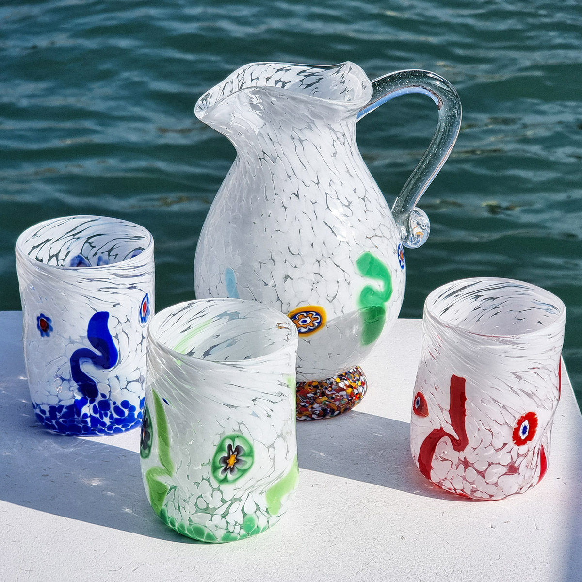 Cool set of 3 Murano glasses with murrine millefiore and multicolor glass rods. Perfect for every day use for drink water, wine, cocktails, coke and aperitive, to impress your guests.