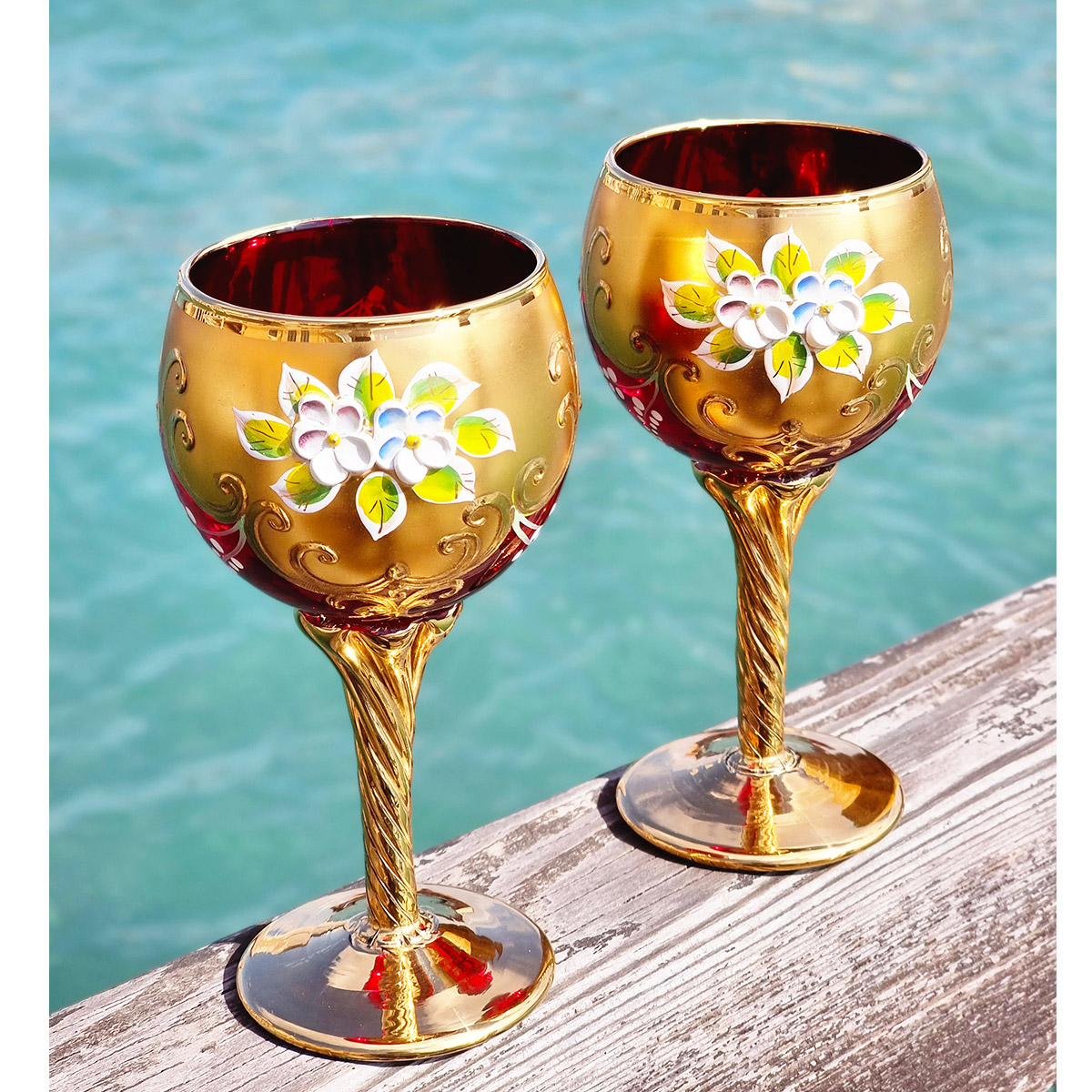 Those glassware of high quality are handmade one by one, blown and painted by free hand by our italian artisans with gold and enamels.