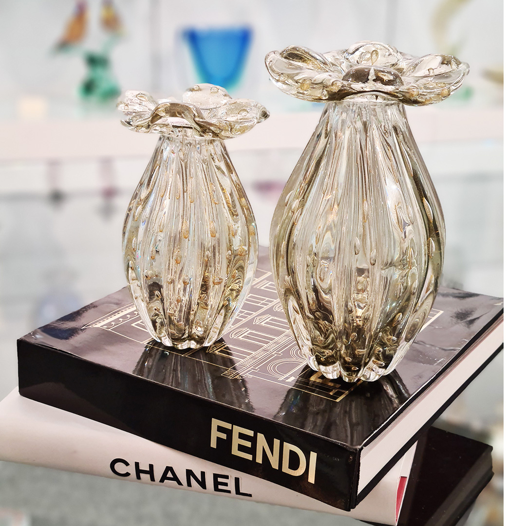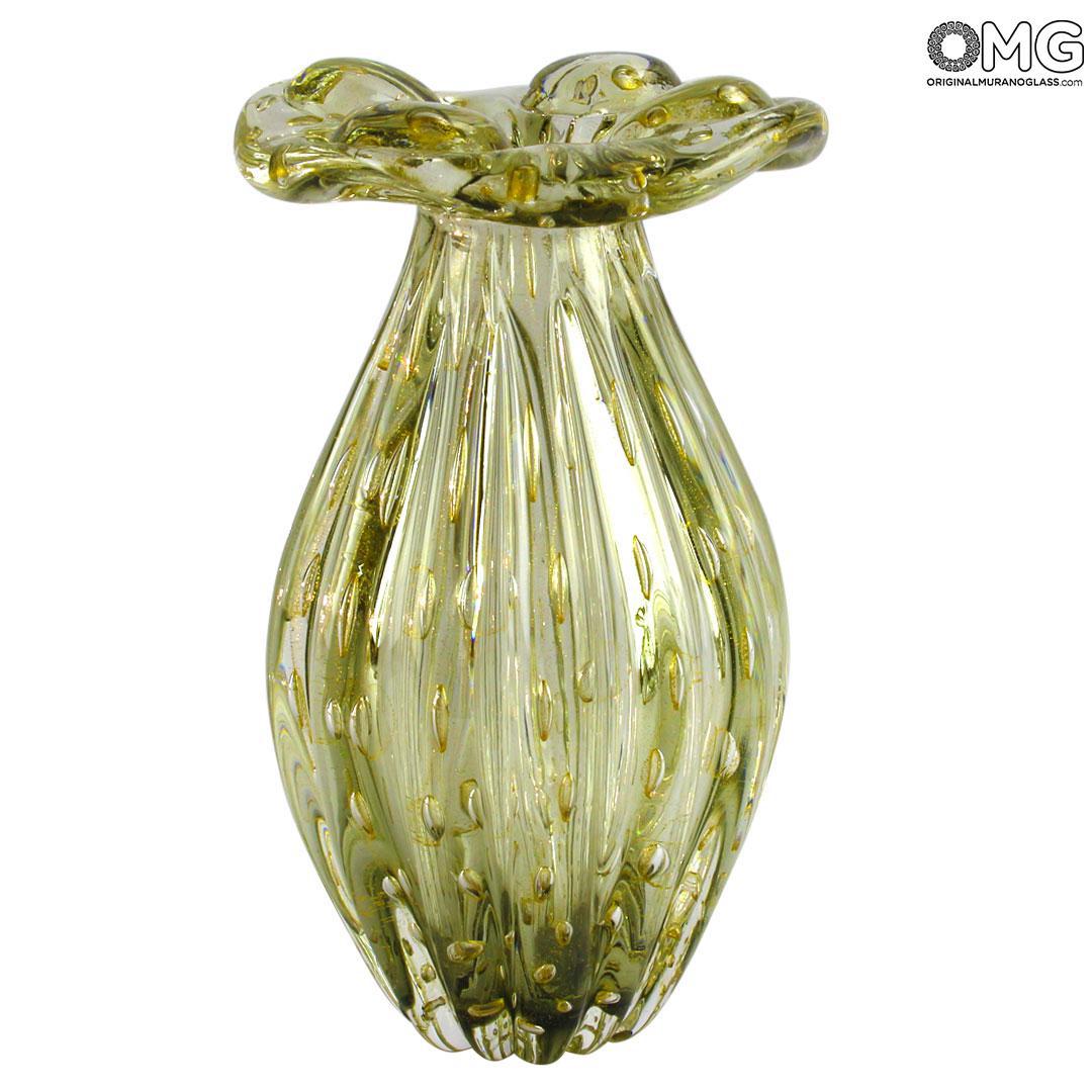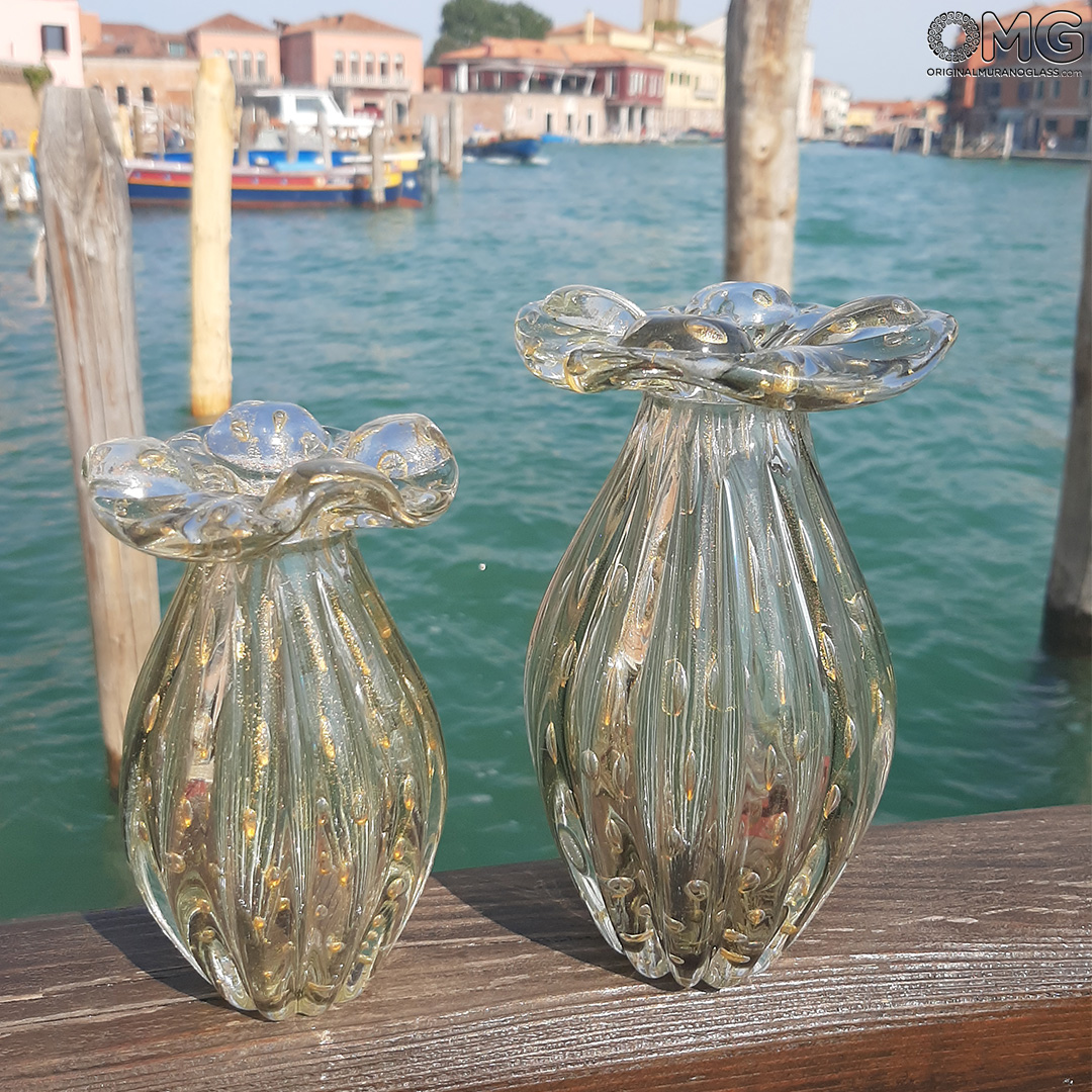 Luxury hand made vase inspired by the 60s in venetian glass. This art work is a condensed of different techniques, superbly expressed. The glass master has firstly to create a particular texture of submerged bubbles embellished with pure 24kt gold leaf. Then he has to finish the vase using the sommerso technique.