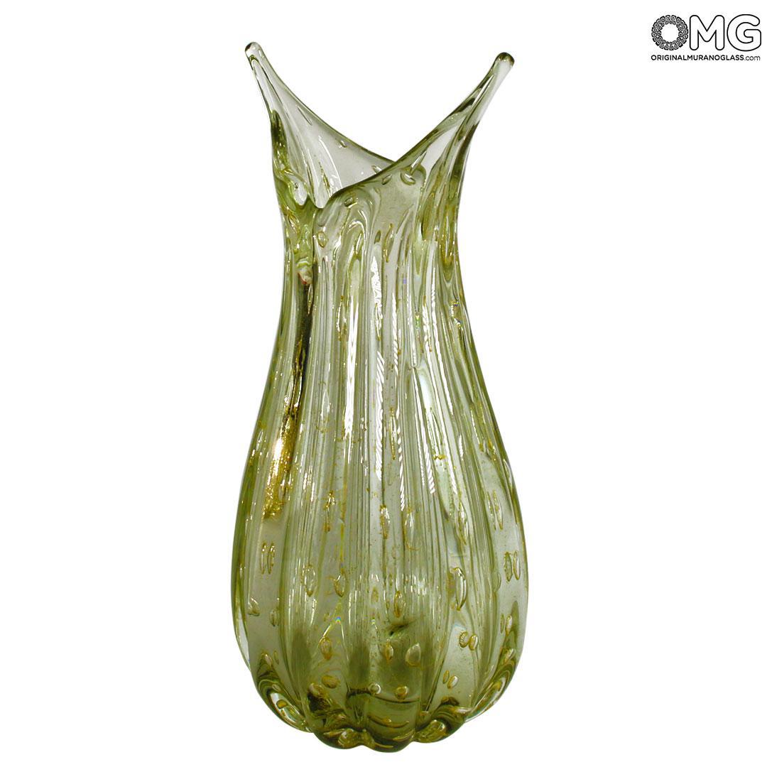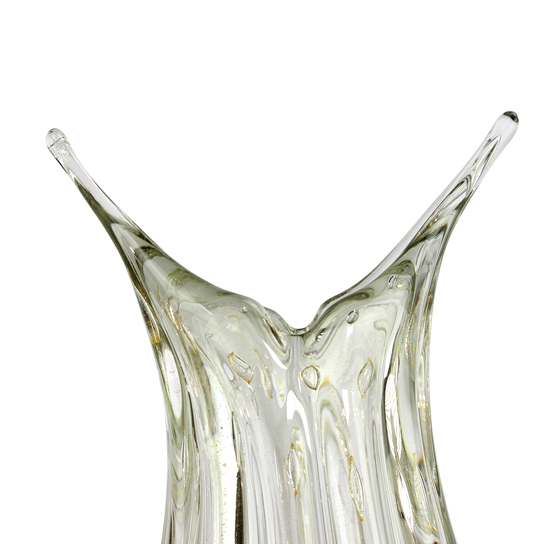 Using a precise Italian glass-making technique known as “bullicante,” skilled artisans created a pattern of evenly spaced air bubbles in layers of glass and pure gold 24kt. An incredibly tricky technique to master where the artisan introduces air bubbles via the pontil rod as the glass is blown.Gold 24K is also used,