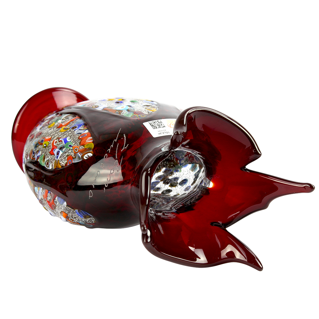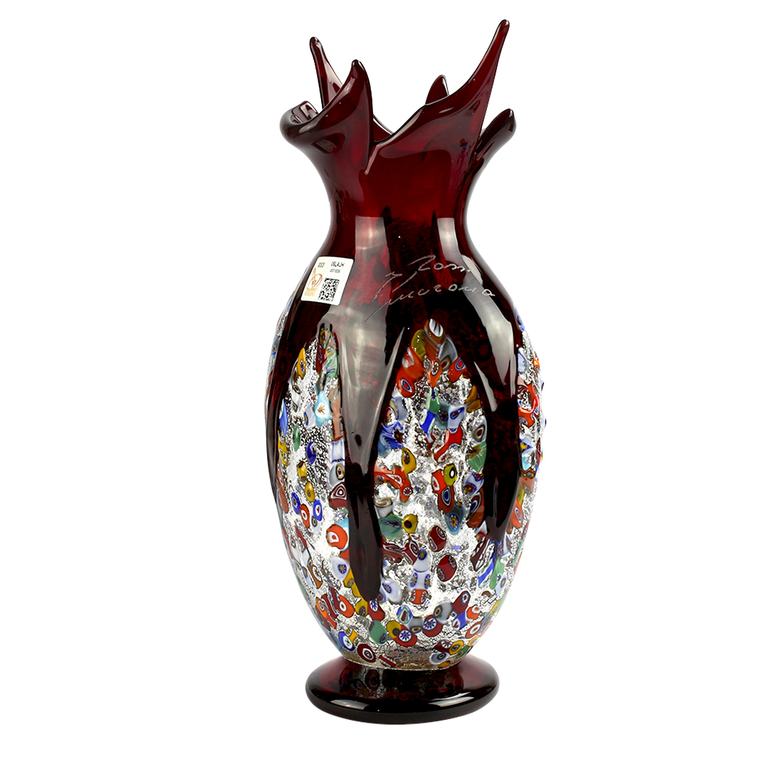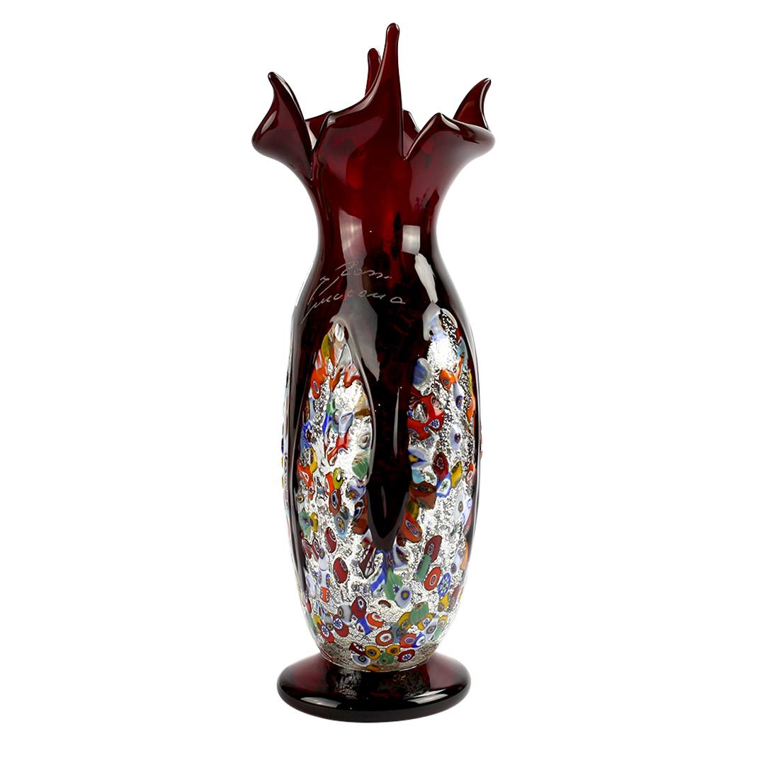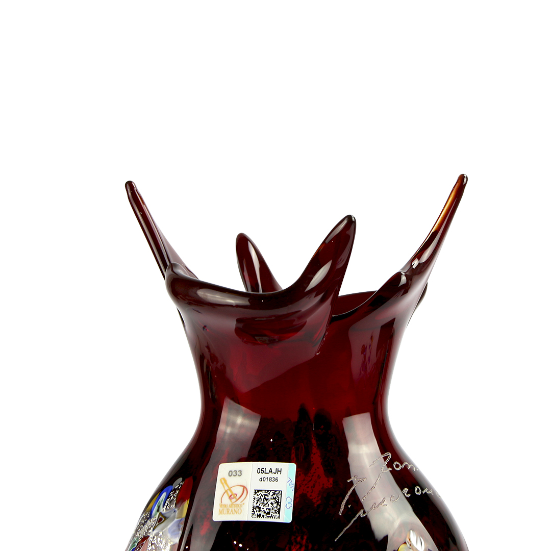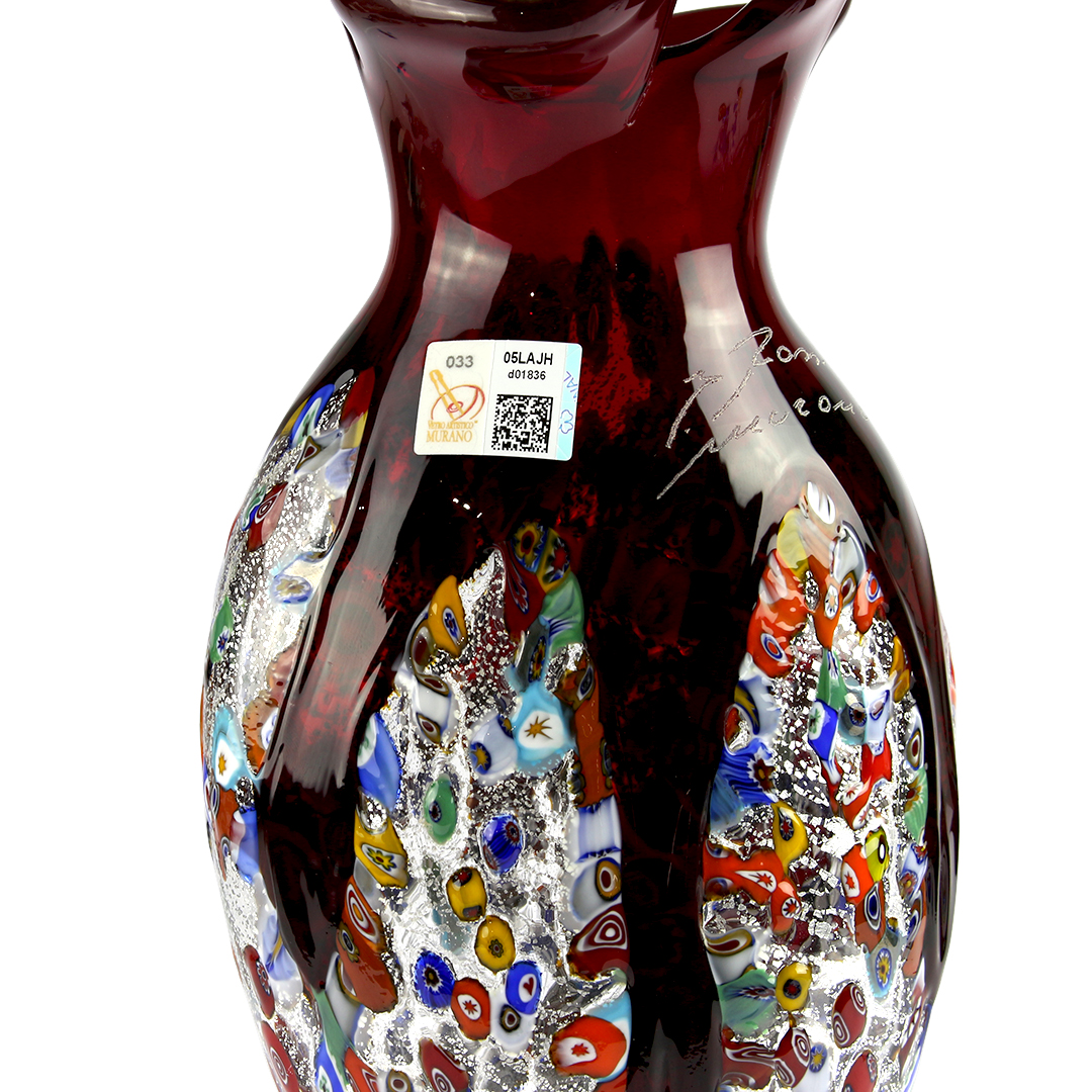 Vase handmade with the technique of red glass blowing with silver and murrina milelfiori decoration. The artwork is signed by the glass master and with Vetro Artistico® Murano trademark applied.