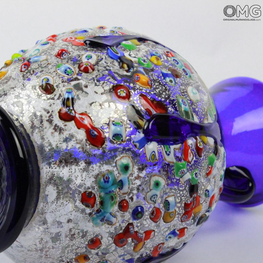 Vase made with the technique of blown glass, decorated with silver leaf and colorful variegated murrine.