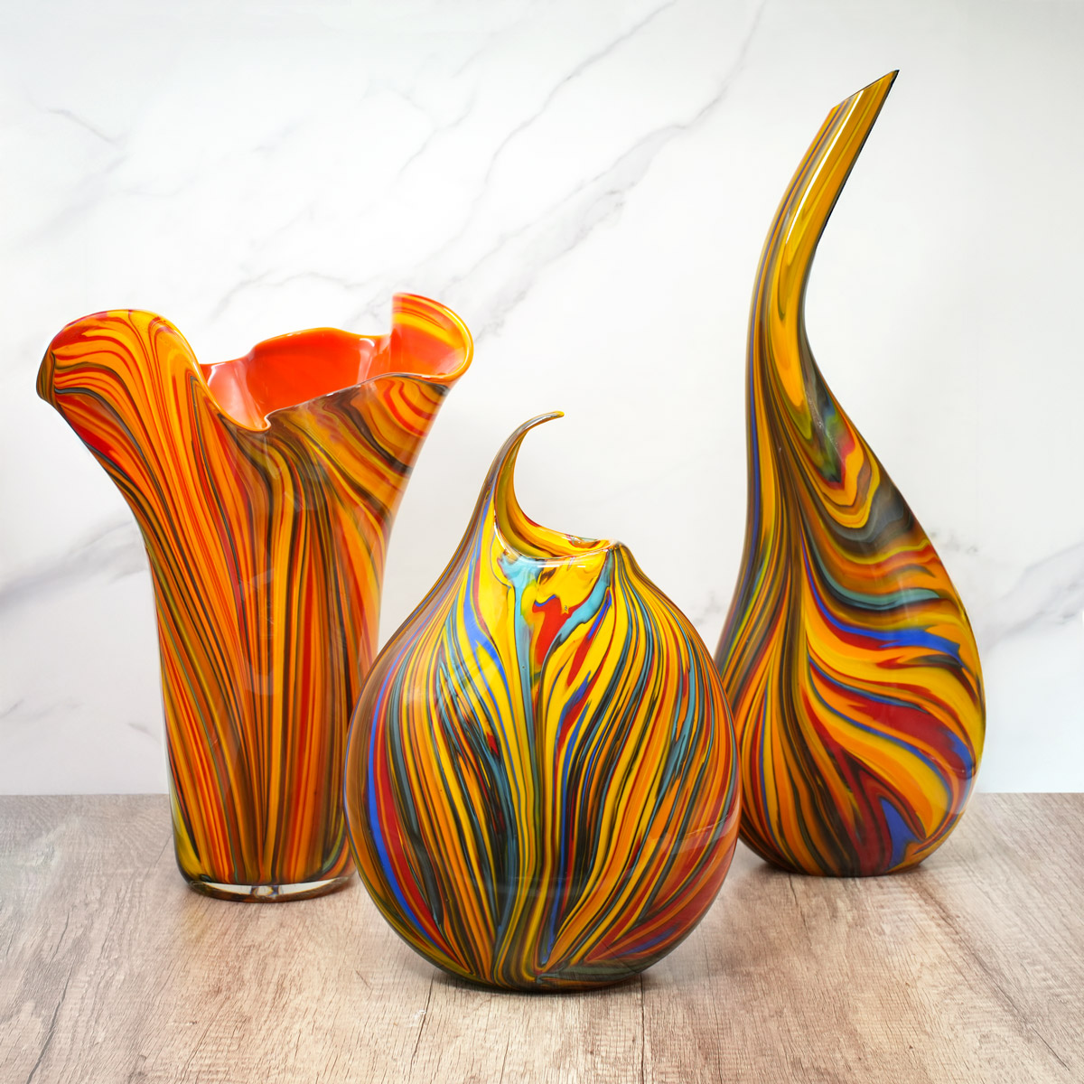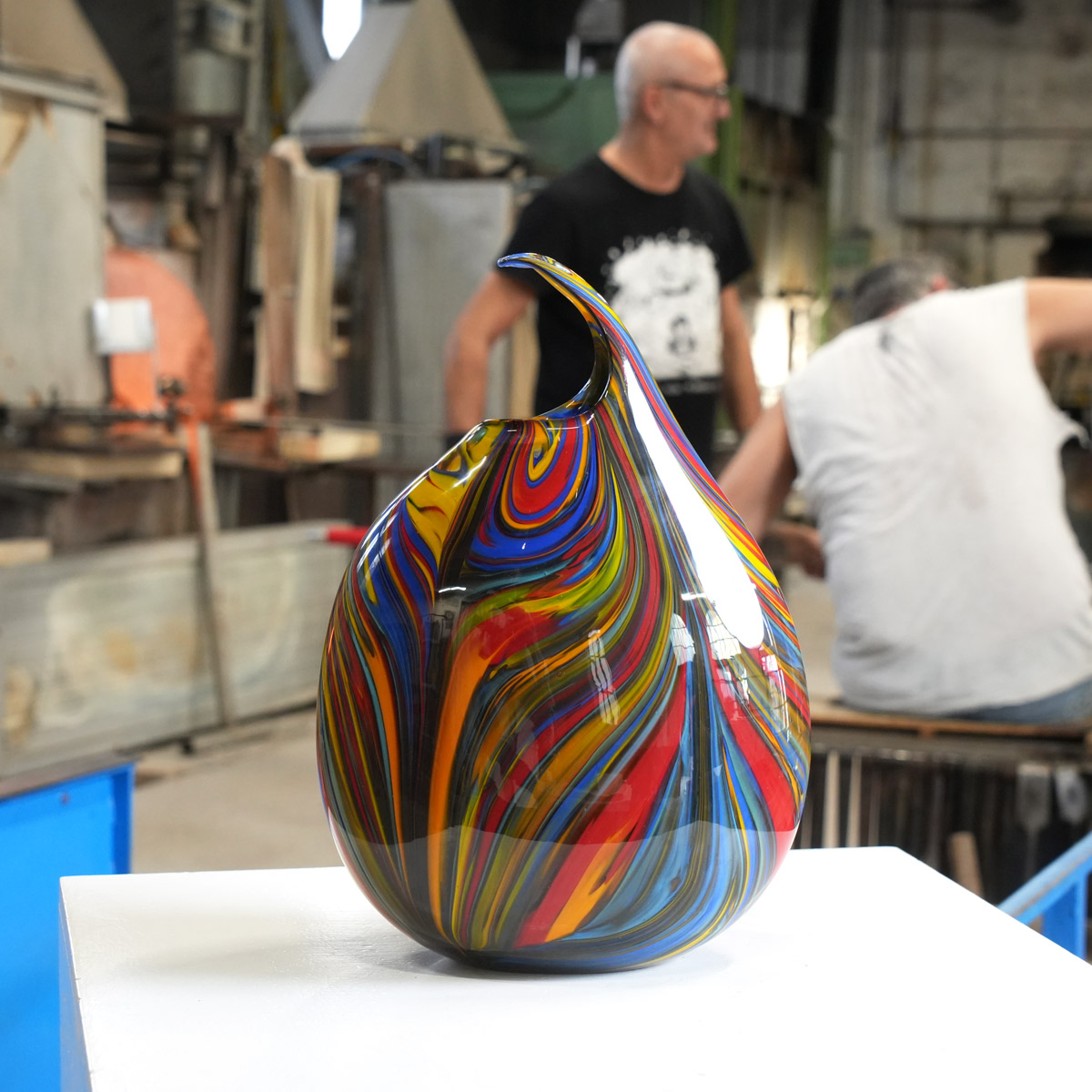 El jarrón soplado está elaborado mediante la técnica del soplado de vidrio, con una mezcla de muchos colores vivos diferentes.