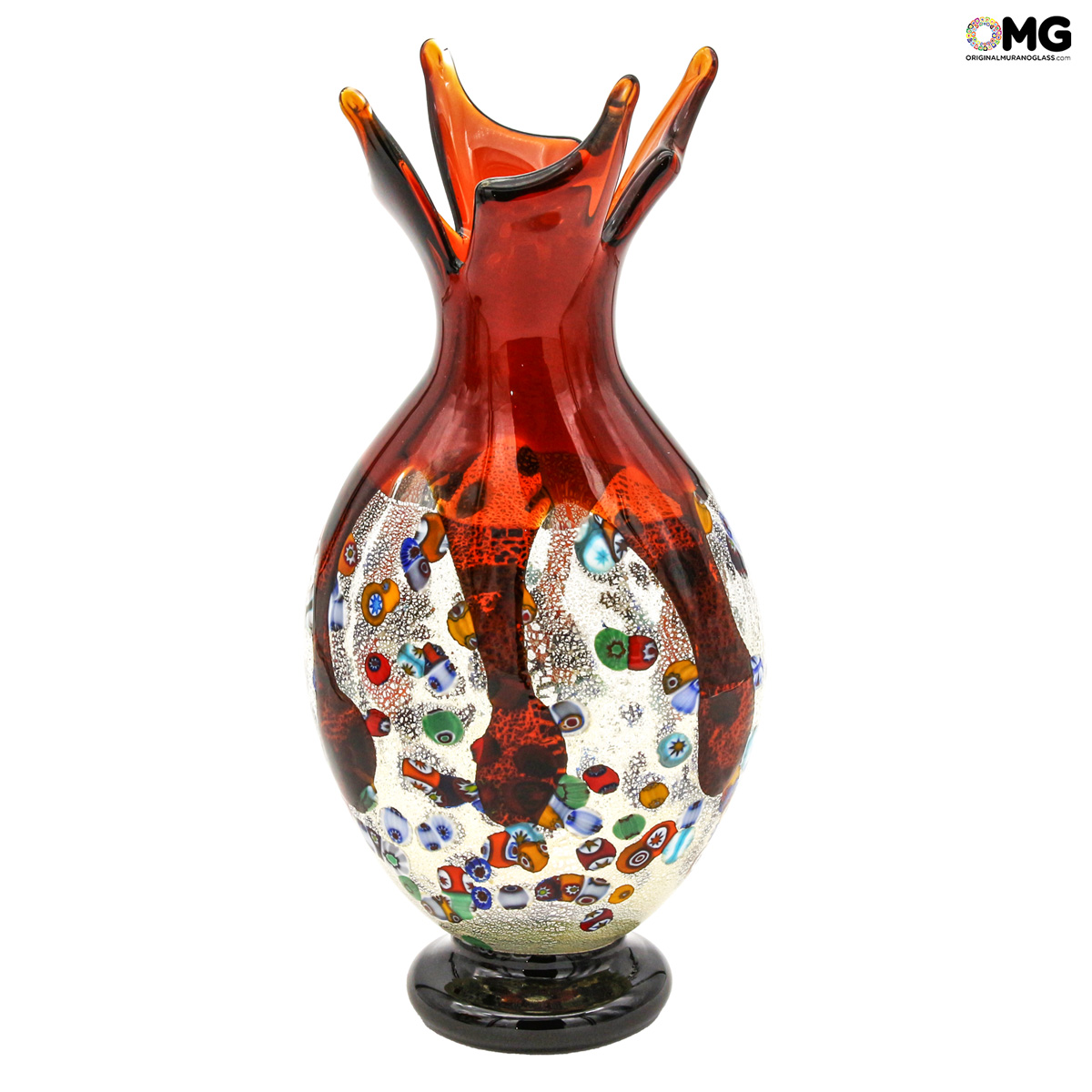 Vase handmade with the technique of glass blowing with silver and murrina milelfiori decoration. The artwork is signed by the glass master and with Original Murano Glass OMG® trademark applied.