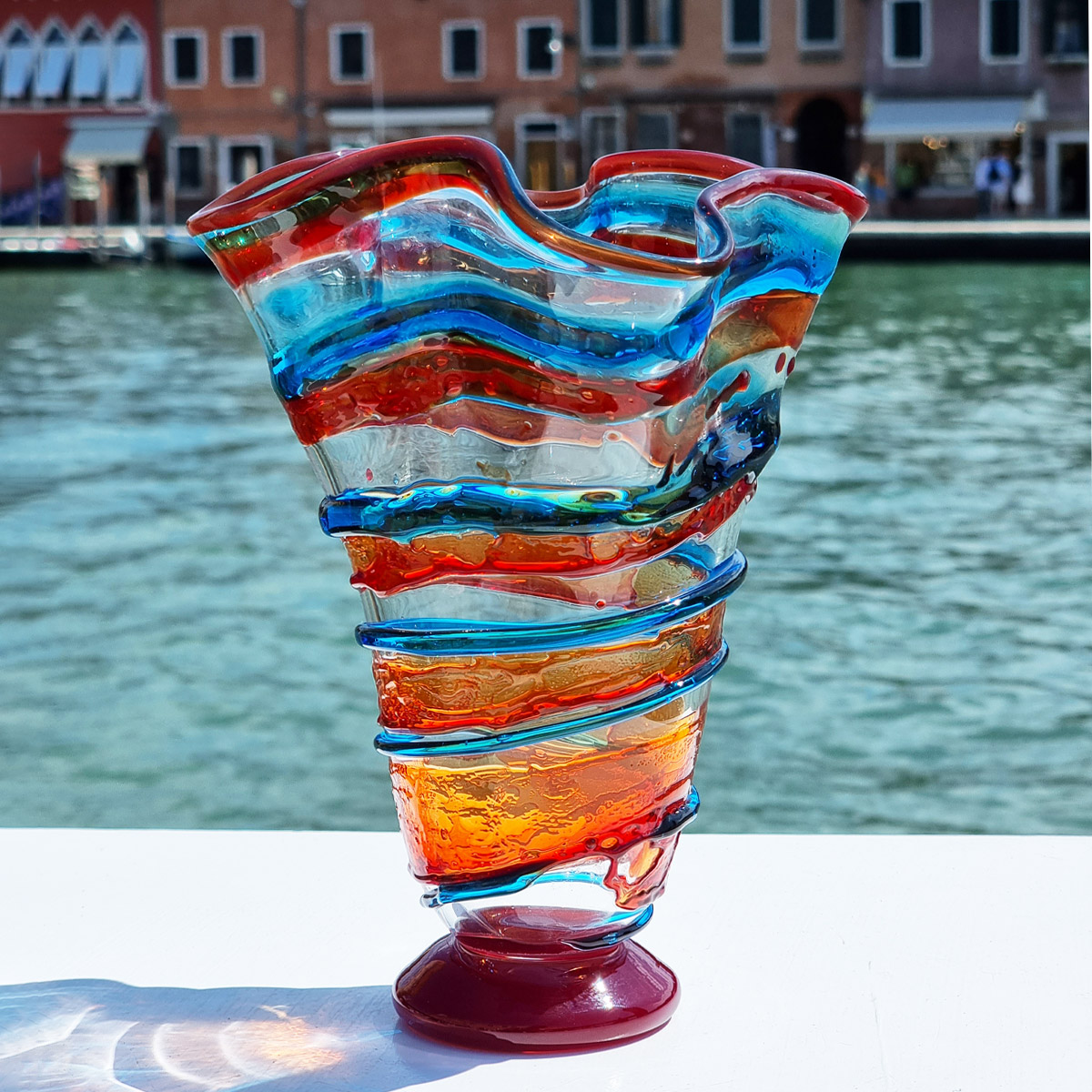 Gorgeous abstract threads of color wrap the bottom of this shimmering blue vase, bringing to life the unique vision of the artist inspired by a mix of art trends from Art Nouveau of Klimt to Abstract Expressionism of Kandinsky. Wavy, almost fluid form of the vase completes the vision and brings elegant touch of Venetian art to the design. Enjoy this beautiful vase in your home, or give it as a fine rare gift for a momentous occasion to the special people in your life. The vase is very well packaged to avoid damage . The vase is a unique piece of art made by hand, hence some variations of colors and patterns inside glass are possible and serve as additional assurance of the authenticity of this Murano Glass Venetian vase.