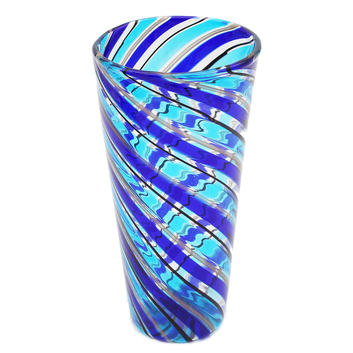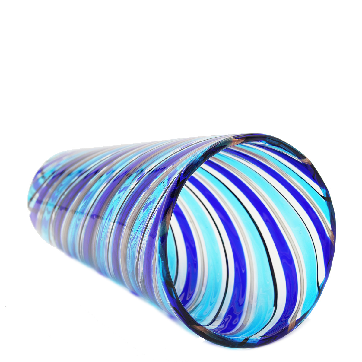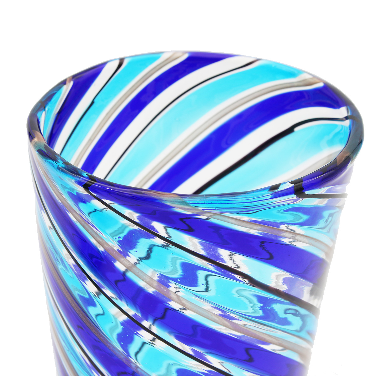 Jarrón veneciano de cristal de Murano original OMG, hecho a mano y soplado con gran atención al detalle. Está elaborado con varillas de cristal azul claro, azul y transparente, y un toque de aventurina, para que el jarrón brille con un esplendor aún más exclusivo.