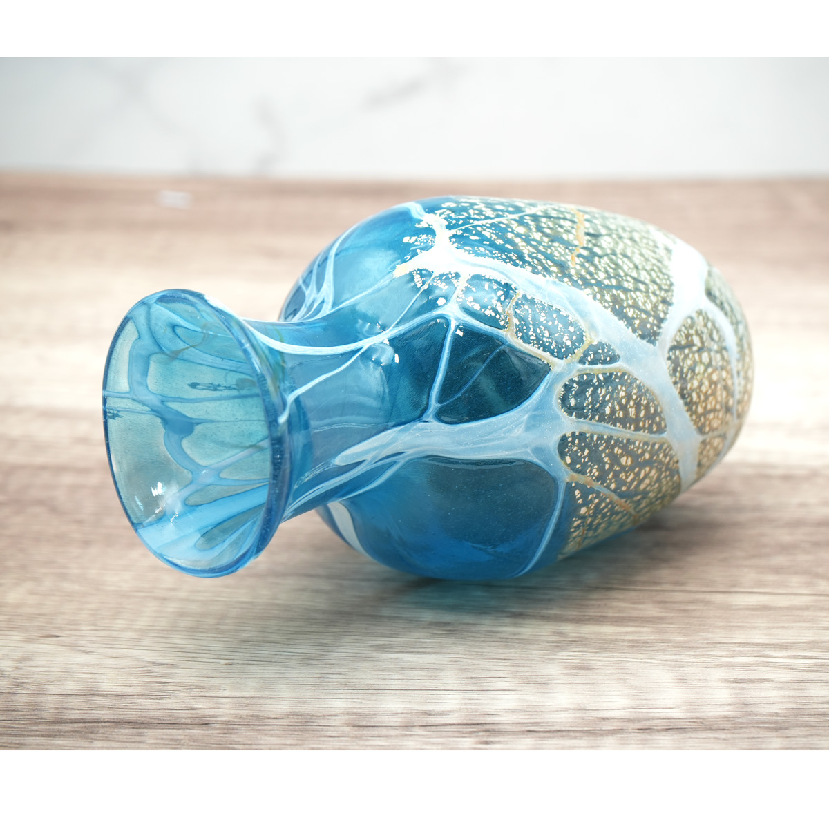 Décor with this handmade blown colored Murano glass vase, standing 20 cm high with a 10 cm diameter. Handcrafted by a master glassmaker, is enlivened by vibrant colored glass, and silver leaf.