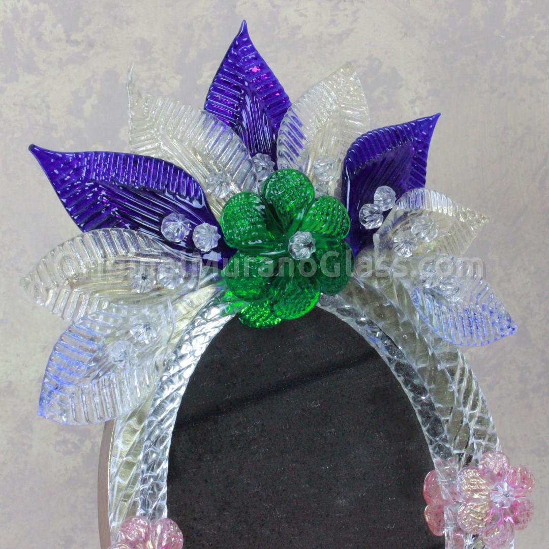 The frame mirror consists of flower and leaves decoration made in authentique Murano glass.