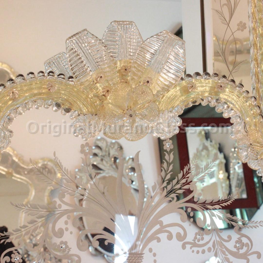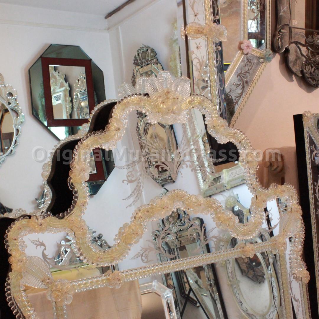 The mirror consists of 38 flowers and canes curls, with glass fused with 24kt gold, and wooden frame.
