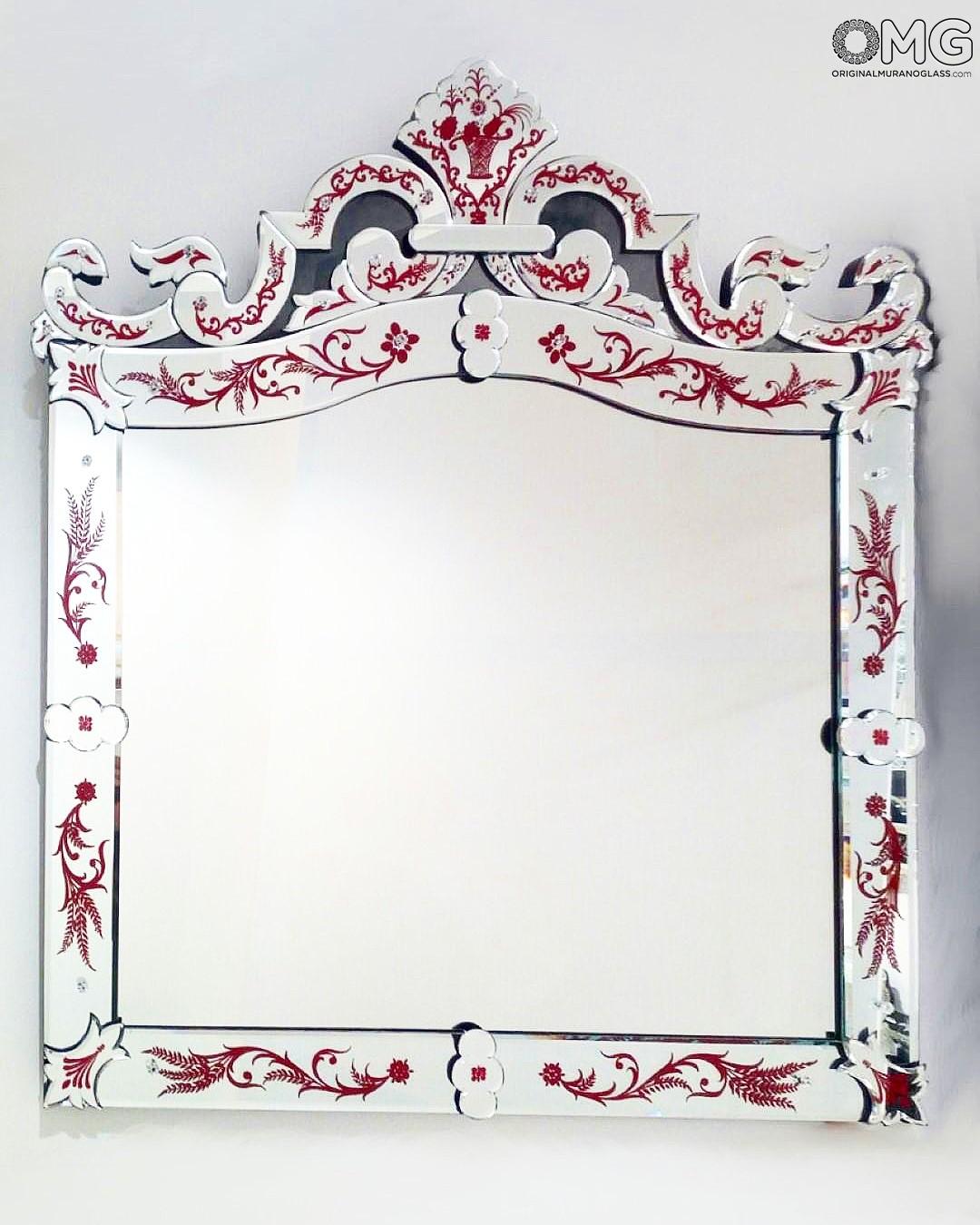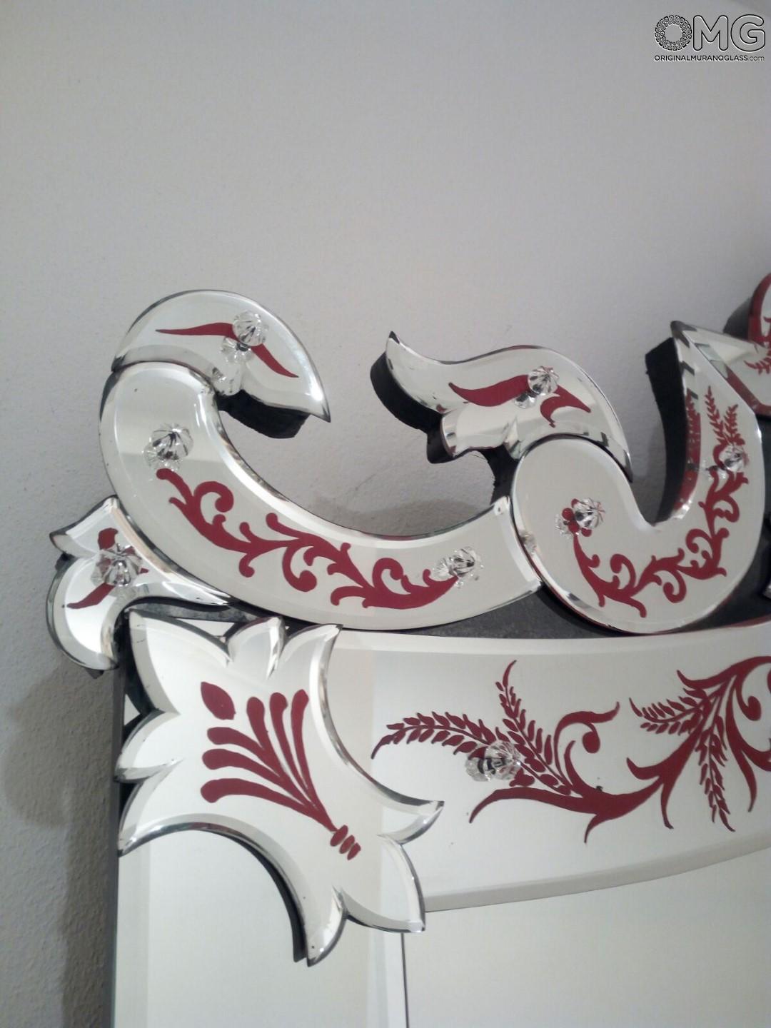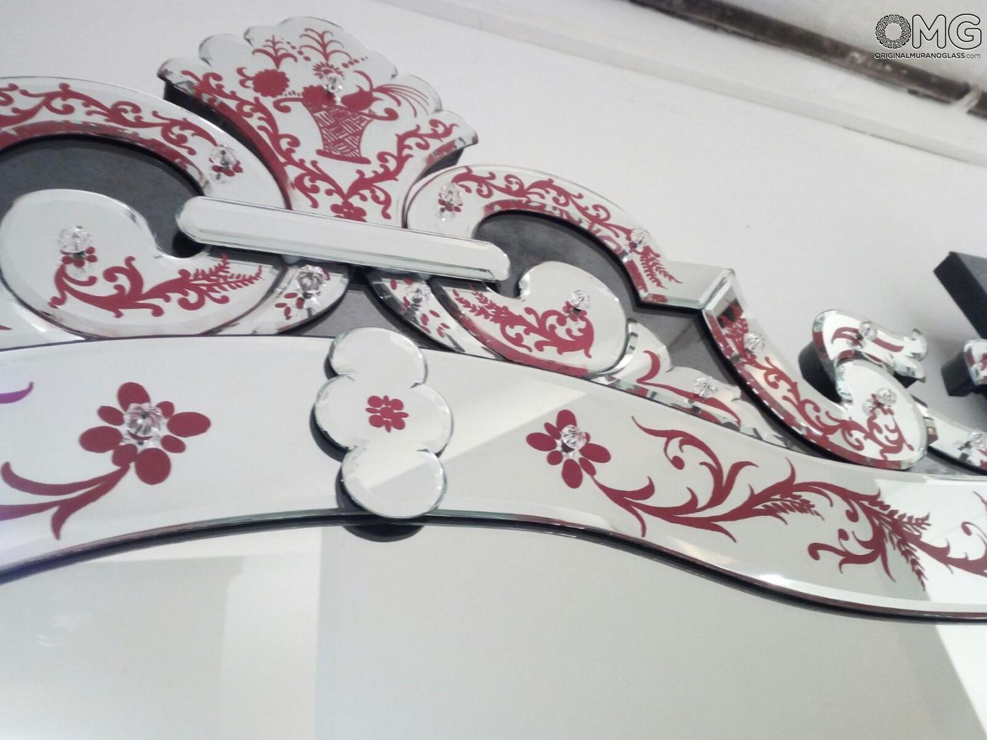 The mirror consists of floral decoration with painted red details.