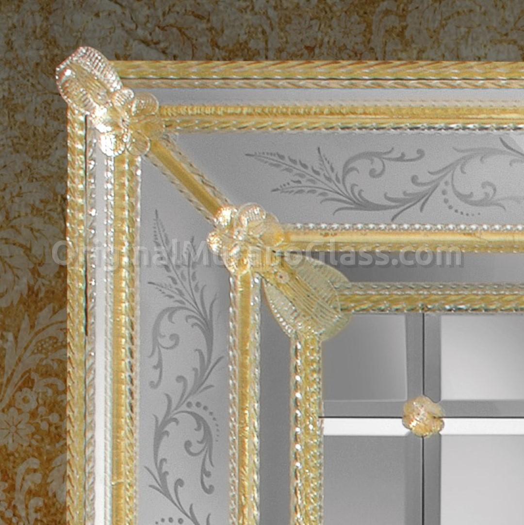 The mirror consists of 40 flowers and canes curls, with glass fused with 24kt gold, and wooden frame.