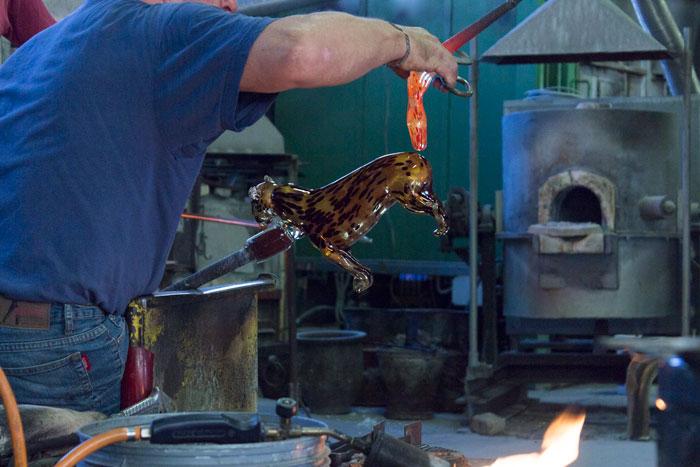 These objects are the fundamental ones which the Master uses within the furnace: they are a rigid selection within an armament of tools many more hefty and multifaceted. In furnace, in the sculpture practise there can be distinguished two main style: the alla prima production, namely the creation of a subject, such as a little horse or flower, starting from one quantity of glass, without adding in a second time and heating up the artwork during the creative process. It is made all in once, even though in many phases – necessary for each artwork, challenging at the level of dimension of technique complexity. Taking as example a human figure of one meter in size – a piece of considerable dimensions, thus, even from the point of the weight, since the glass is full – to the Master and his assistants will be worthwhile proceeding in steps. The head will be obtained from an incandescent sphere, prior uniformed through the use of the magiosso, and later shaped with the borselle, by various operation of pulls and pushes of plate or cutting. Throughout the process, according to the richness of details, the artwork should take a calda, namely being put into the kiln for roughly 10 seconds to re-heat the glass for making it malleable and optimal for the process again.